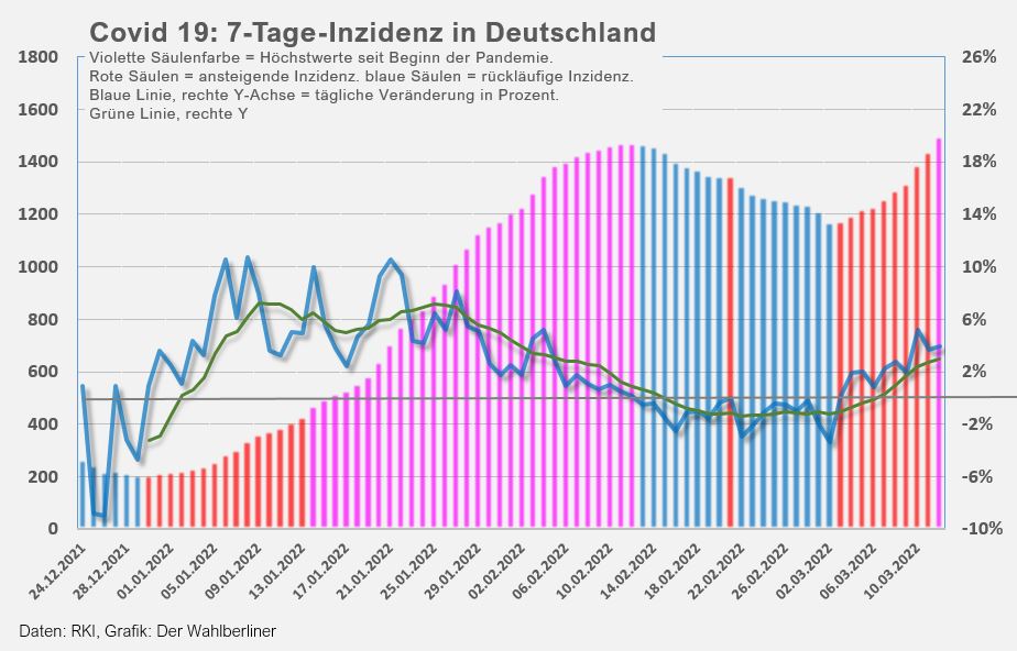 Der 13. Des Monats fällt zwar nicht auf einen Freitag, trotzdem ist es ein besonders negativer in der Geschichte der Corona-Pandemie. Die 7-Tage-Inzidenz (Zahl der Neuinfektionen pro 100.000 Einwohner innerhalb von 7 Tagen) ist bundesweit auf 1.496 gestiegen. Das ist der höchste Wert seit Pandemiebeginn, der bisherige Rekord lag bei 1474,3 und war am 12.02.2022, also vor einem Monat und einem Tag, erreicht worden. Seitdem ging es zunächst leicht abwärts, der Anstieg in den letzten Tagen war aber stärker als die vorherige Abwärtsbewegung, sodass ein ununterbrochener Anstieg von nur 10 Tagen ausreichte, um den Wert auf ein neues Allzeithoch zu treiben.