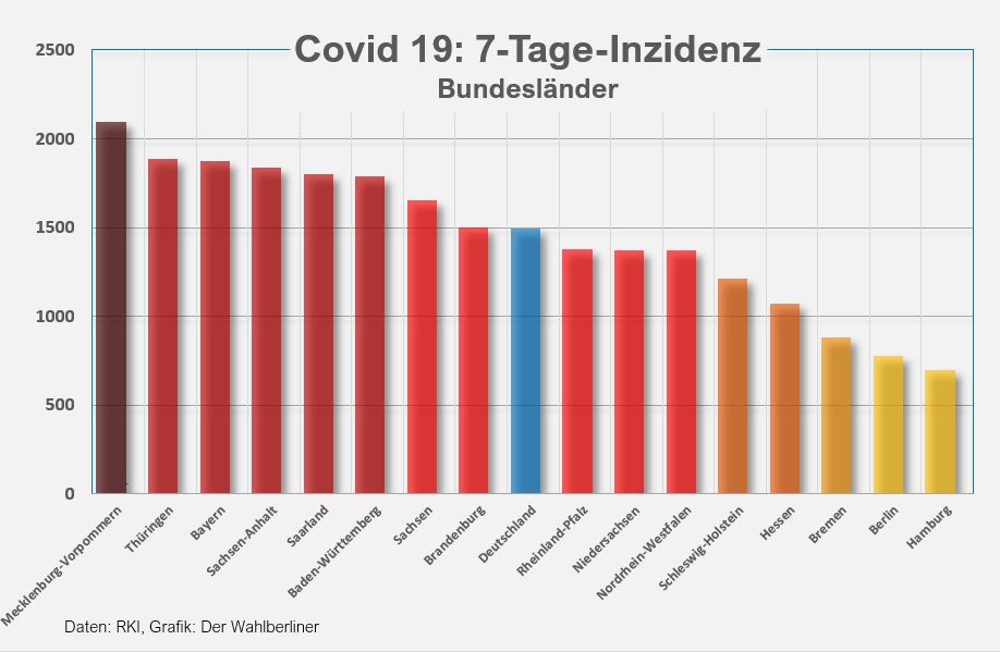 Wir haben mittlerweile das erste Bundesland mit einer Inzidenz von über 2.000 seit dem Beginn der Omikron-Welle. Es ist Mecklenburg-Vorpommern, das nun die Liste anführt. Auch in anderen Ländern steigt die Inzidenz wieder erheblich, am stärksten, wie schon in der Hochphase der Delta-Welle, im Osten mit bis zu 10 Prozent Plus gegenüber gestern. Die geringste Steigerungsrate weist NRW auf (0,68 Prozent), das hat auch dafür gesorgt, dieses und andere große Bundesländer mit noch vergleichsweise geringen Steigerungsraten, wie Hessen, hat dafür gesorgt, dass die Gesamtinzidenz in Deutschland nicht noch stärker in die Höhe geschossen ist. Auch die Stadtstaaten, die zu Beginn der Corona-Welle die höchsten Inzidenzwerte aufwiesen und jetzt am Ende der Liste stehen, zeigen wieder steigende Zahlen. In einigen Bundesländern sind die Zahlen seit Monaten permanent hoch, etwa in Bayern.