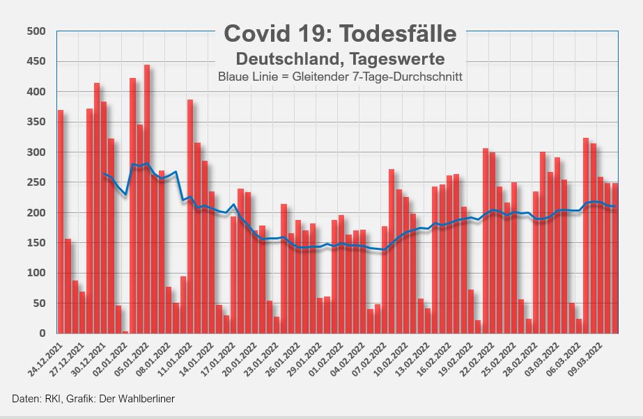 „Die Wochentendenz bei den Todeszahlen an / mit Corona in Deutschland ist leicht abwärts gerichtet, der Tagesdurchschnitt liegt nun bei ca. 140 Meldungen in den letzten sieben Tagen“, schrieben wir am 08.02.2022. Seitdem hat sich leider ein Anstieg auf ca. 220 ergeben und es wirkt nicht, als ob demnächst mit wesentlicher Entspannung zu rechnen wäre. Die 7-Tage-Inzidenz weist einen Anstieg von 2 Prozent auf hohem Niveau aus. Wir müssen eine Zahl von gestern korrigieren. Der Report 56/22 wies eine Steigerung von 14 Prozent aus, das war aber die Zahl vom Langreport 39/22, auf dem die aktuellen Darstellungen nun wieder basieren, weil das Corona-Geschehen sich wieder verschärft. Gestern dürfte der 7-Tage-Durchschnittswert um 2 oder 3 Prozent angestiegen sein.