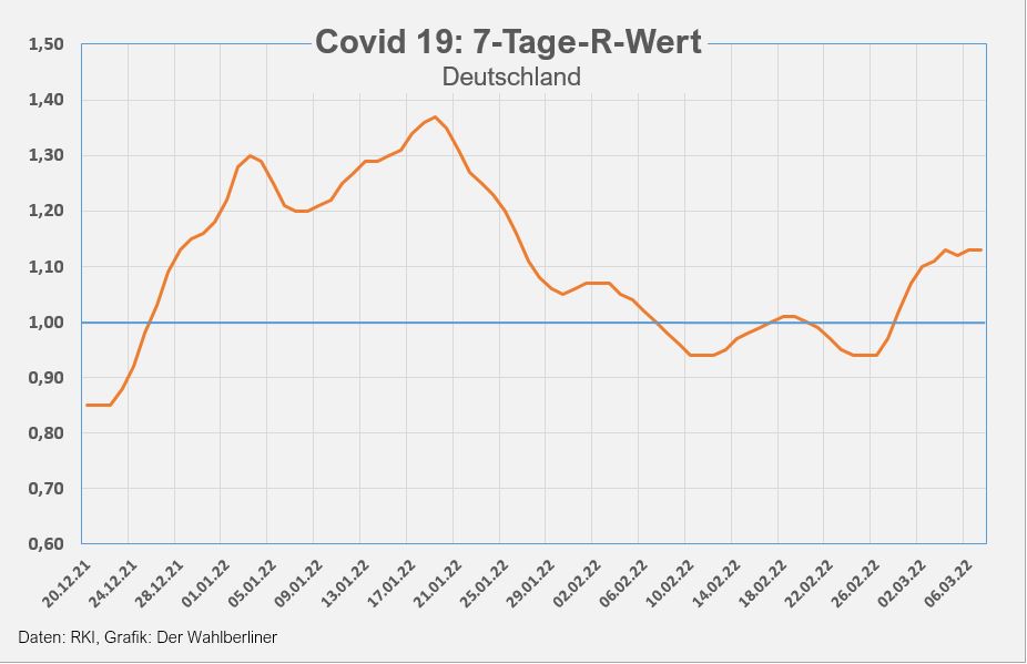 Es stimmt zwar, dass der R-Wert zwischenzeitlich unter die Nulllinie gesunken war, aber nicht sehr deutlich. Gegenwärtig sieht es wieder anders aus. Allein der am 09.03. erstmals gezeigte R-Wert vom 03.03. wurde am 10.03. um 7 Punkte von 1,01 auf 1,08 angehoben. Das war die stärkste Nachkorrektur von einem auf den anderen Tag, die wir bisher gesehen haben. Auch heute wurden für die letzten Tage wieder Korrekturen nach oben vorgenommen, der aktuellste Wert vom 07.03. liegt bereits bei 1,11. Werte von über 1,10 sind ein Zeichen dafür, dass dringend gebremst werden müsste, aber die Politik scheint darauf nicht entsprechend zu reagieren.