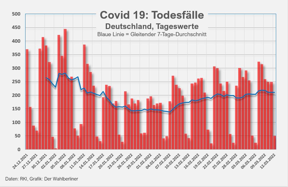„Die Wochentendenz bei den Todeszahlen an / mit Corona in Deutschland ist leicht abwärts gerichtet, der Tagesdurchschnitt liegt nun bei ca. 140 Meldungen in den letzten sieben Tagen“, schrieben wir am 08.02.2022. Seitdem hat sich leider ein Anstieg auf ca. 210 ergeben und es wirkt nicht, als ob demnächst mit wesentlicher Entspannung zu rechnen wäre. Die 7-Tage-Tendenz weist einen Anstieg von 1 Prozent auf hohem Niveau aus. Wir müssen eine Zahl von gestern korrigieren.