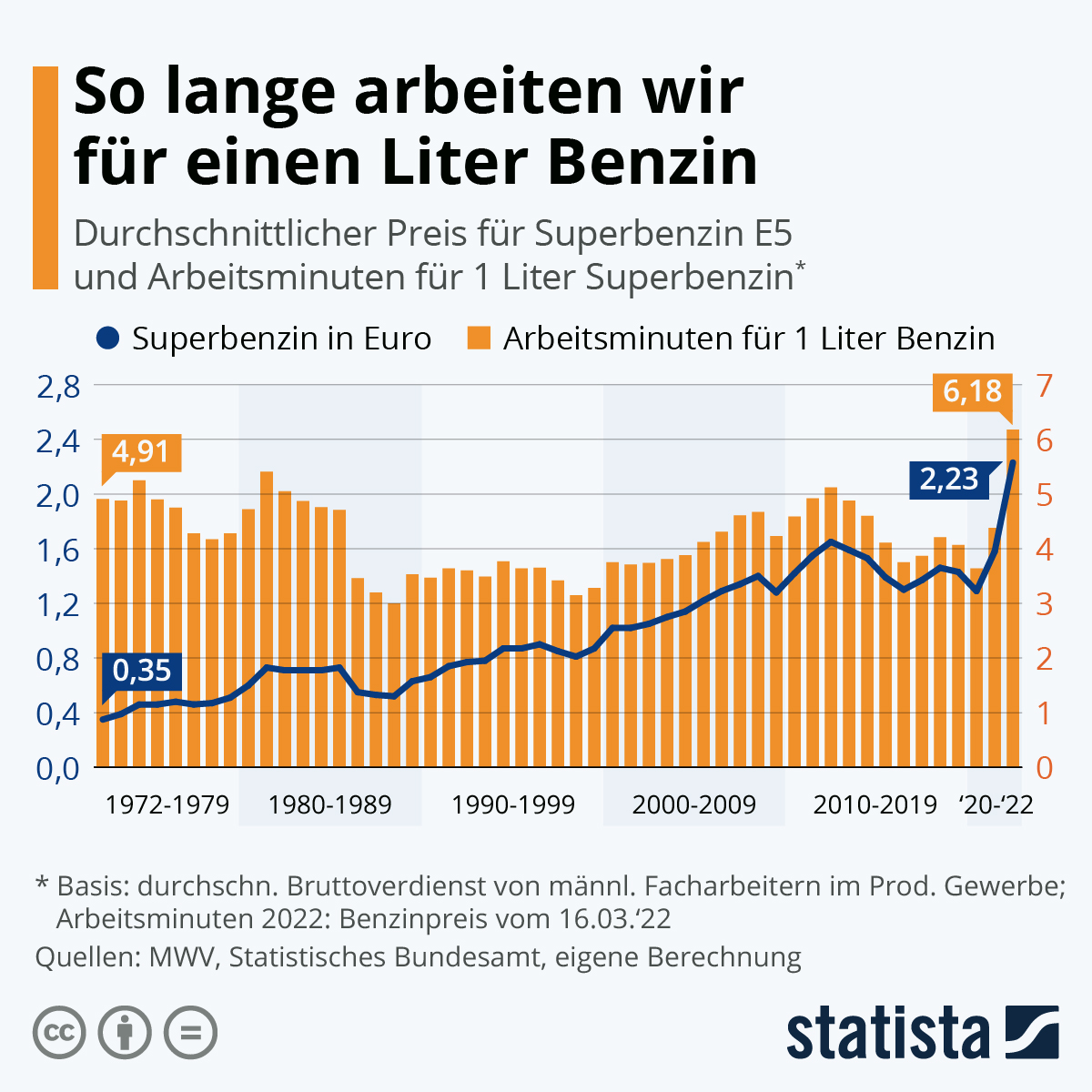 Hier können wir mit dem Update vom 18.03. nahtlos anschließen. Wir hatten zuletzt geschrieben, das reale Benzinpreisniveau bewegt sich etwa auf dem Stand von vor zehn Jahren. Ganz stimmt das nicht, wie die nachfolgende Grafik zeigt. Wir hatten in der Tat den Peak in den Jahren 2011, 2012 im Kopf, als wir viel mit dem Auto unterwegs waren. Mit Firmen-Tankkarte überwiegend, daher war der damals schon relativ hohe Benzinpreis für uns eher ein Non-Event. Relativ zu den Löhnen ist er allerdings jetzt so hoch wie nie zuvor seit Beginn der 1970er, inklusive der Jahre also, in denen die berüchtigten Ölpreisschocks kamen, die dann auch 1973 zu autofreien Sonntage führten, allerdings – wenn man die Spitzen vor einigen Tagen zugrundelegt, wie Statista das hier getan hat. Seit Beginn der 1970er ist es jetzt erstmalig der Fall, dass für einen Liter Super mehr als 6 Minuten gearbeitet werden muss. Wir kommentieren selbstverständlich unterhalb der Grafik, denn das ist ja doch alles eine sehr politische Angelegenheit: