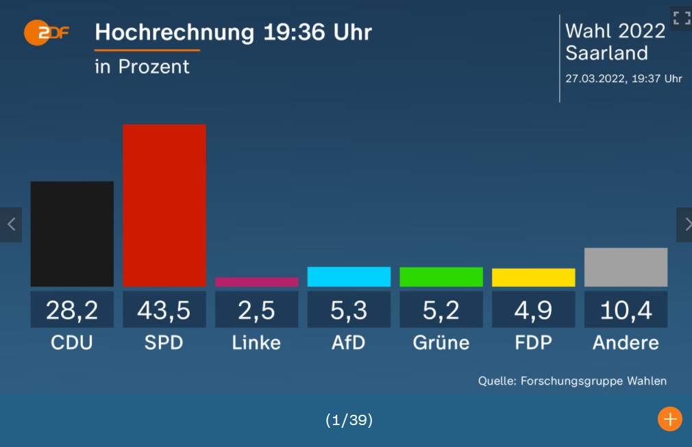 Bereits um 20 Uhr ist alles klar. Nun ja, noch nicht ganz, aber im Grunde doch. Die SPD hat im Saarland einen Erdrutschsieg erzielt, proportional dazu die heftigen Verluste der CDU. Hier die aktuellen Zahlen, ZDF-Hochrechnung von 19:36 Uhr: