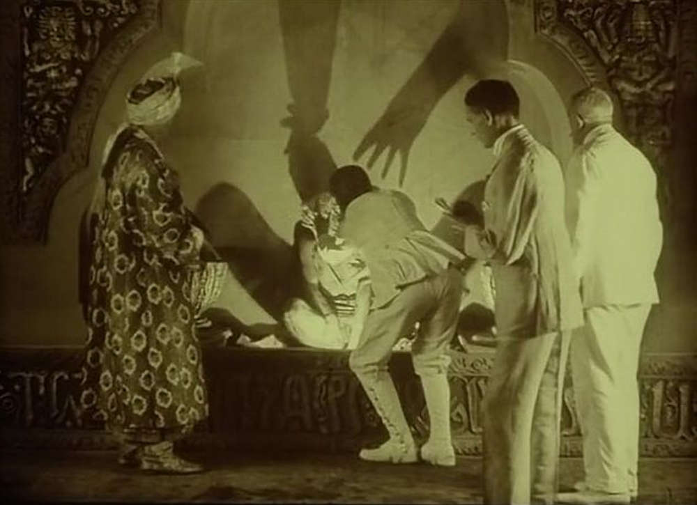 Danach gehen die Autoren von „Klassiker“ zu Fritz Lang selbst über, dem damals schon Weitgereisten, welcher demnach in der Tat aus seiner Erfahrung schöpfen konnte oder zumindest aus den Bildern der Welt, die er als junger Mann in sich abgespeichert hatte. Damit hatte er den meisten Menschen damals viel voraus, die nie über die Landesgrenzen hinausgekommen waren, vermutlich aber auch den meisten heutigen Touristen, die andere Bilder sehen und, wenn sie die Bilder von damals sehen würden, sie nicht zu einem solchermaßen Reigen verbinden könnten, wie er oben geschildert wird. Über den Hype mit exotischen Schauplätzen im deutschen Film gegen Ende des Ersten Weltkriegs und in den Jahren danach haben wir uns anhand anderer Rezensionen bereits geäußert. Mit „Die Spinnen“ hat Lang dazu nicht unwesentlich beigetragen, man kann auch sagen: Kein Regisseur damals, der auf sich hielt, und sich da nicht hineinkniete. So Lubtisch z. B. in „Sumurun“, Joe May mit „Das indische Grabmal“, Robert Reinert mit „Opium“ und sicher zahllose andere, deren Filme wir niemals wieder anschauen können, weil sie verloren sind oder irgendwo vergraben wurden, ganz unten in der großen Schatzkiste der Murnau-Stiftung, von denen auch die wenigsten nur annährend so grandios gewesen sein dürften wie diejenigen, die wir schon besprochen haben und noch besprechen werden, wenn wir halbwegs anschaubare Kopien davon auftreiben können. Die Bildqualität von „Die Spinnen“ war schon grenzwertig und ich muss ich etwas anstrengen, damit sich das nicht auf die Bewertung durchschlägt, weil doch manches in dem Film recht überstürzt wirkt. Stellt man es sich um ein Drittel langsamer ablaufend vor, wird dieser Eindruck nicht vollständig verfliegen, aber natürlich wirkende Bewegungsabläufe sind schon wichtig, um das Gepräge eines Films perfekt einschätzen zu können, seinen Rhythmus und wie etwa die Interaktion von Menschen wirkt.