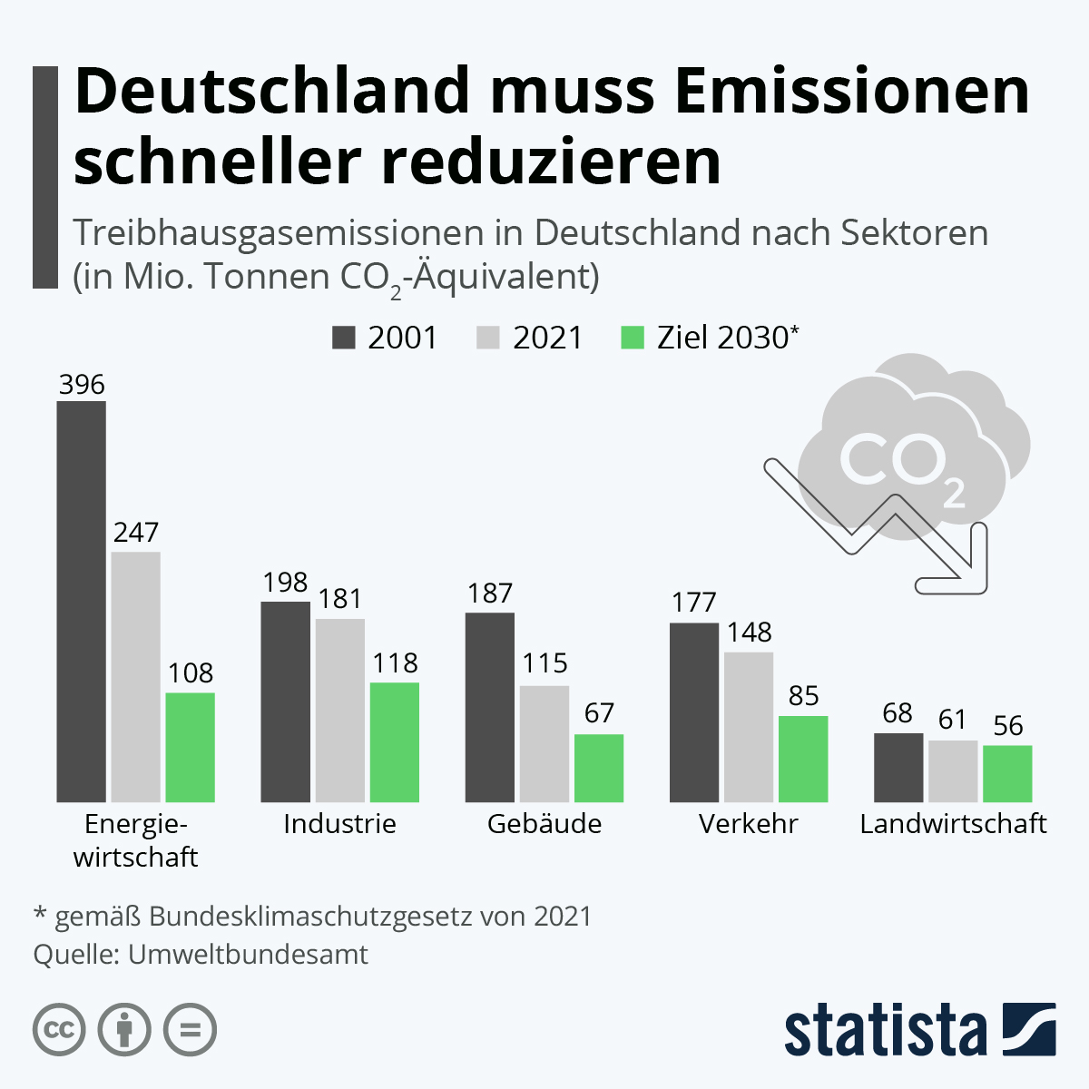 Die Verringerung der Treibhausgasemissionen in Deutschland muss deutlich an Geschwindigkeit zulegen, um die im Bundesklimaschutzgesetz festgelegten Ziele noch erreichen zu können. Das zeigt die Statista-Grafik auf Basis von Daten des Umweltbundesamts. So sind die Emissionen im Sektor Energiewirtschaft in den vergangenen 20 Jahren um 38 Prozent gesunken. Bis 2030 müssten sie noch einmal um 56 Prozent sinken, um die Ziele der Bundesregierung zu erreichen. Die Emissionen in den anderen Sektoren müssen zur Zielerreichung ebenfalls schneller sinken: Bei der Industrie um 35 Prozent, bei Gebäuden um 42 Prozent und beim Verkehr um 43 Prozent gegenüber dem Niveau von 2021. Der Landwirtschaftssektor generiert die geringsten Emissionen und muss diese gegenüber 2021 noch um 8,2 Prozent sinken. Auch dies bedeutet aber eine Beschleunigung, denn von 2001 bis 2021 sind die Emissionen in diesem Sektor lediglich um 10 Prozent gesunken.