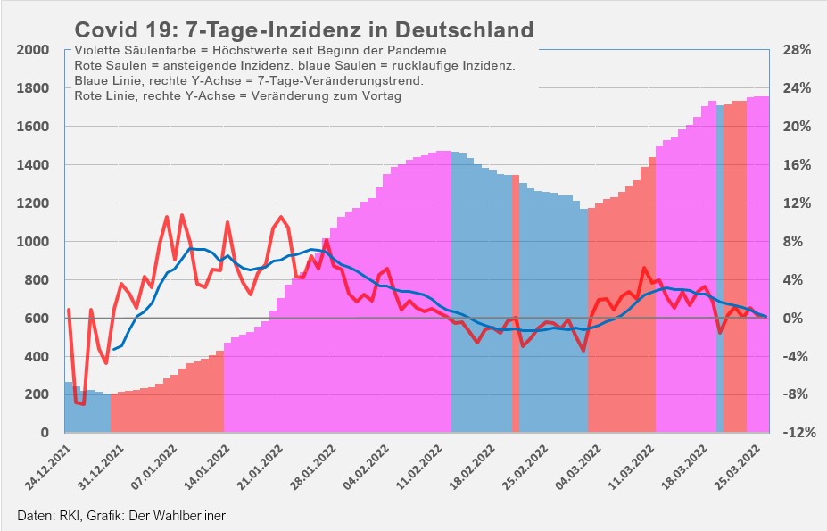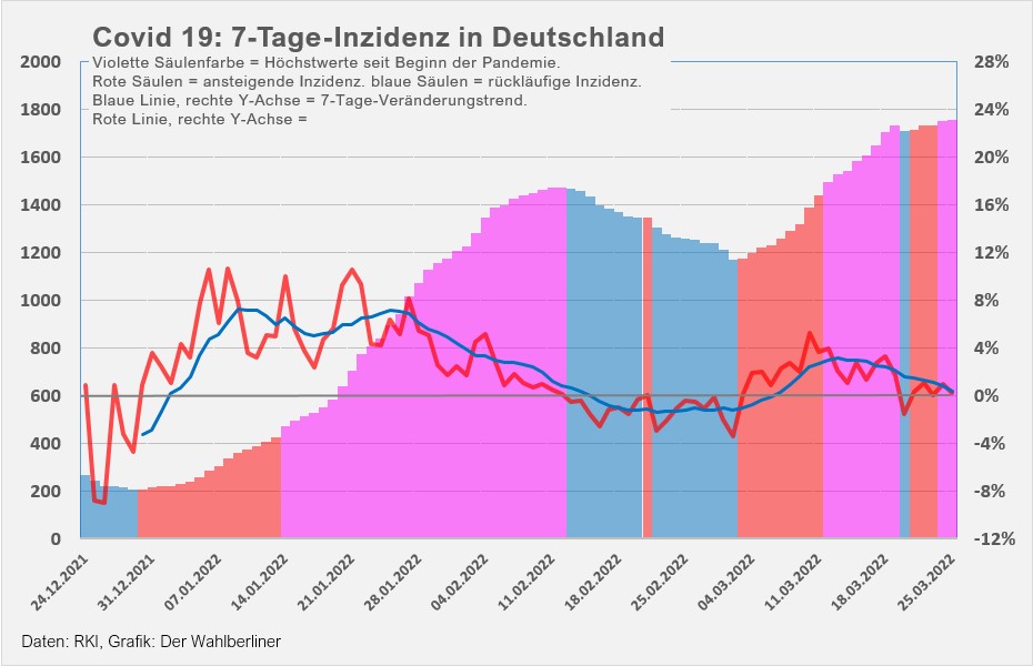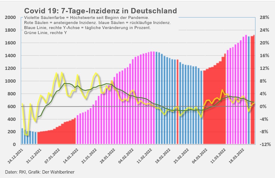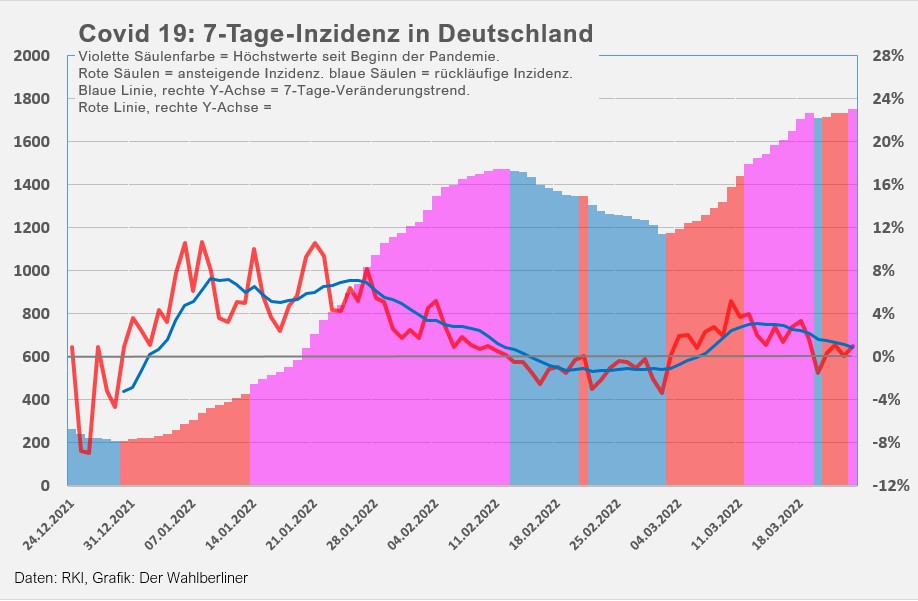 - Die 7-Tage-Inzidenz in Dutschland steigt minimal von 1733,4 auf 1734,2 und verharrt damit ganz knapp unter dem Höchststand von 1.735, erreicht am vergangenen Samstag, den 19.03.