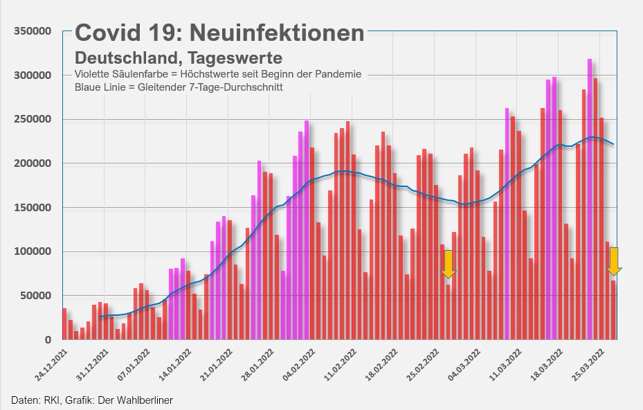 Obwohl morgen mit dem offiziellen Ende des bisherigen Infektionsschutzgesetzes und vielen neuen bzw. alten Freiheiten bei sehr hohen Infektionszahlen ein neues Kapitel in der Corona-Geschichte beginnt, ist die Nachrichtenlage heute dünn, der Ukraine-Krieg beherrscht die Schlagzeilen. Deswegen halten auch wir uns kurz und melden uns, vermutlich schon morgen, mit irgendwelchen neuen Rekordzahlen. Denken Sie aber bitte daran, dass einige Bundesländer bestimmte Maßnahmen (richtigerweise) aufrechterhalten wollen und informieren Sie sich, was für Sie gilt. Und vergessen Sie bitte die Zeitumstellung nicht. Von Samstag auf Sonntag kriegen wir alle eine Stunde Schlaf geklaut. Zeit, gegen die Diktatur auf die Straße zu gehen, zu umgestellter Zeit, aber kurz vor Zwölf ist es ja eh immer.