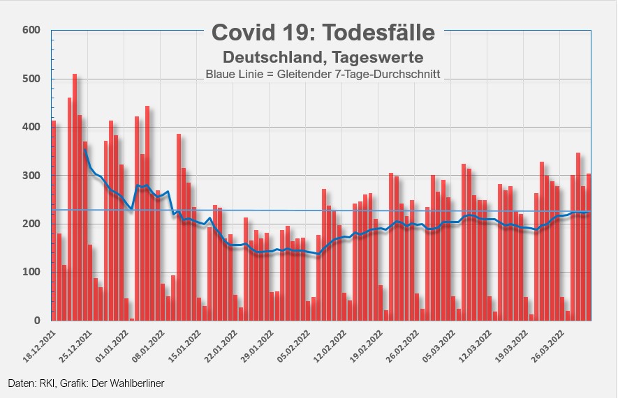 - Bedrückend ist leider auch die Zahl der gestern gemeldeten Todesfälle von 329. Das ist die höchste Zahl seit 11.01.2022, damit steigt auch die Todesfallrate in Deutschand im Wochenvergleich um weitere 8 Prozent an. Wem das egal ist, sehen wir in der Politik, wo gelockert wird, als sprächen die Corona-Zahlen auf Rekordniveau nicht eindeutig für mehr Vorsicht.
