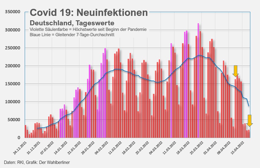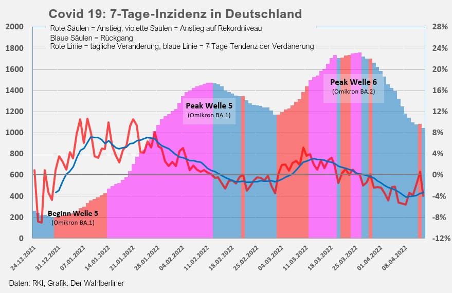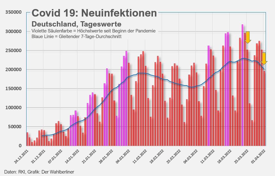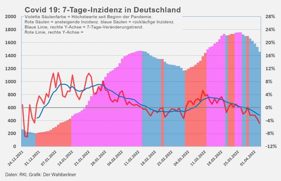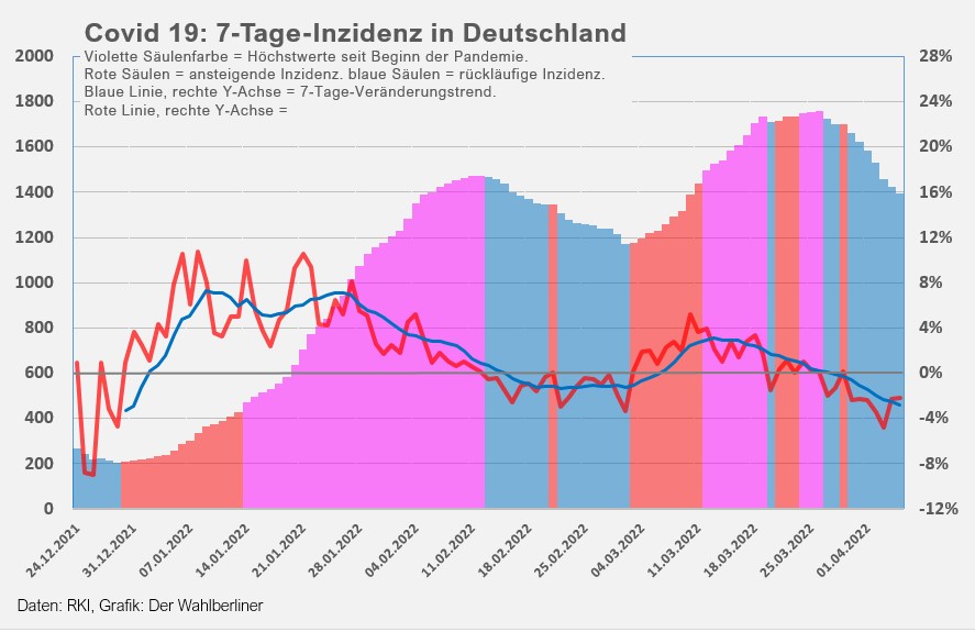 Ob der Rückgang der letzten Tage schon eine Aussage über den Einfluss der Abschaffung fast aller Corona-Maßnahmen am 01.04.20222 zulässt, ist fraglich, solange sich die meisten Menschen weiterhin vorsichtig verhalten. Eine Trendänderung war jedenfalls bisher nicht zu bemerken.