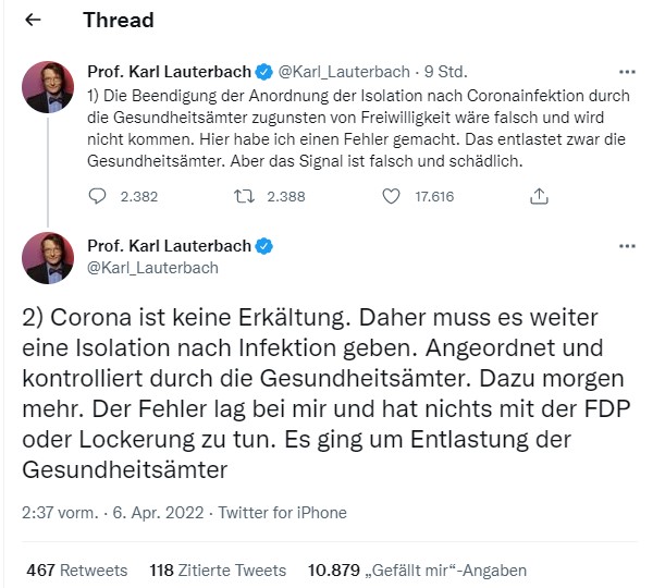 Immerhin trendet heute auf Twitter mal wieder etwas zu Corona: #Lauterbachmussweg. Jetzt ist es für den Gesundheitsminnister endgültig schwierig geworden. Die einen werfen ihm weiterhin Panikmache vor, die anderen ärgern sich, dass er der FDP nachgegeben hat und die vielen Lockerungen zulässt. Was uns ärgert: Dass er sogar das Wording der FDP für seine Begründungen verwendet, anstatt sich wenigstens verbal etwas zu distanzieren. Das wirkt, als habe er nicht unter Protest zugestimmt oder mit Zweifeln, die man sehr subtil ausdrücken könnte, sondern sich von den Klassisten und Egoismusapologeten der neoliberalen Partei hat umpolen lassen. Klar, dass die Social-Media-Schüsse auf ihn jetzt auch vom Team Vorsicht abgefeuert werden, das sich auf ihn verlassen hat, und nicht nur, wie bisher, von den Querschlägern, denen der Sieg der Unvernunft nicht genug ist und die unbedingt noch ein Personenopfer wollen. #Lauterbachluegt trendet in dem Zusammenhang natürlich auch wieder. Dabei muss man gar nicht lügen, um nicht überzeugend zu wirken, es reicht, wenn diejenigen, die sich brav an alle Regeln halten, enttäuscht sind über das, was jetzt dank der FDP und derer, die es nicht verhindert haben, auf uns zukommt.