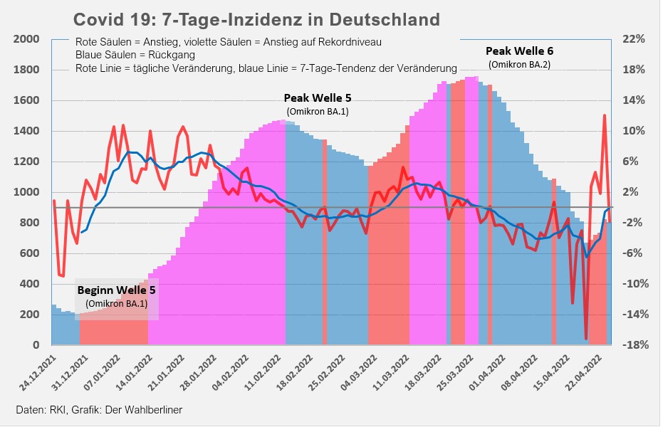Die Inzidenz bildet dies ebenfalls ab und sinkt von gestern auf heute um 26,3 Punkte, von 1.735 auf 1.708,7. Während der fünften Welle, sofern wir jetzt von einer sechsten sprechen, war die Trendumkehr wesentlich langsamer vor sich gegangen, deswegen sprechen wir jetzt auch noch nicht von seiner solchen. Das RKI hat zwar keinen Hinweis darauf gegeben, dass ein Bundesland heute keine Zahlen gemeldet hätte, in der Vergangenheit gab es das hin und wieder. Wir möchten noch die nächsten zwei oder drei Tage abwarten, bis wir uns nachhaltig erfreut zeigen und die Frequenz der Corona-Kurzreporte wieder senken werden, falls sich die heutige Umkehr zu einem Trend entwickelt.