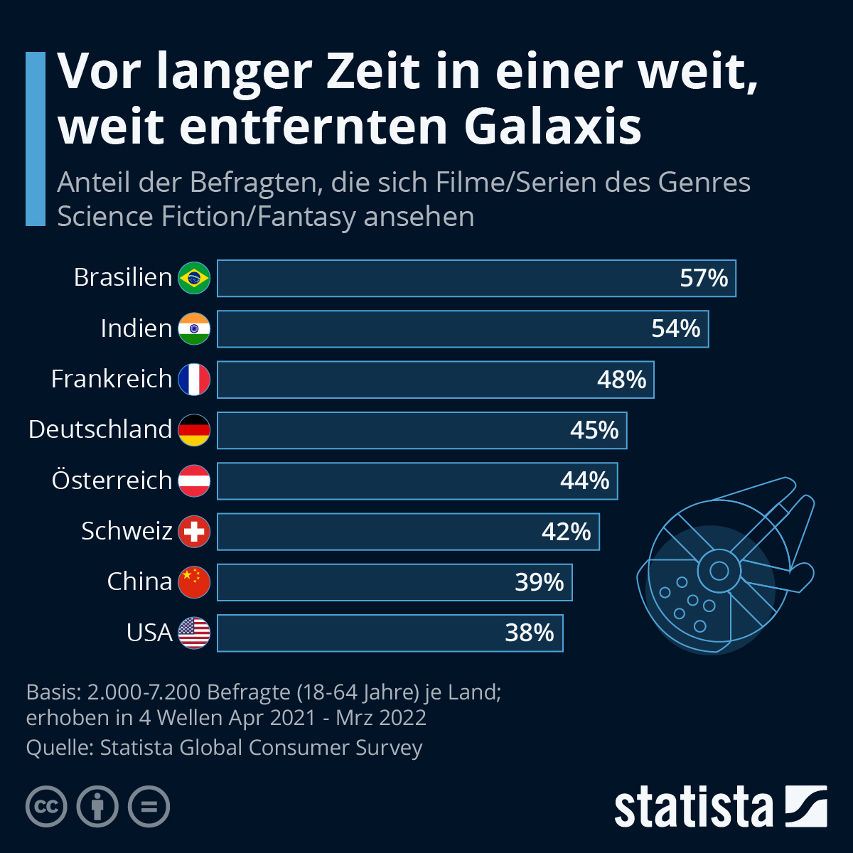 Kommenden Mittwoch heißt es für Star Wars Fans auf der ganzen Welt „May the 4th be with you“. Passend zum Star Wars Day wirft Statista mit Daten des Global Consumer Surveys einen Blick auf das Thema Science Fiction und Fantasy in Filmen und Serien. 45 Prozent der Umfrageteilnehmer:innen aus Deutschland sehen sich Videocontent (TV- und Streaminganbieter) aus diesem Bereich an – beliebter sind nur noch die Kategorien Komödien, Dokumentationen und Thriller/Mystery/Crime.