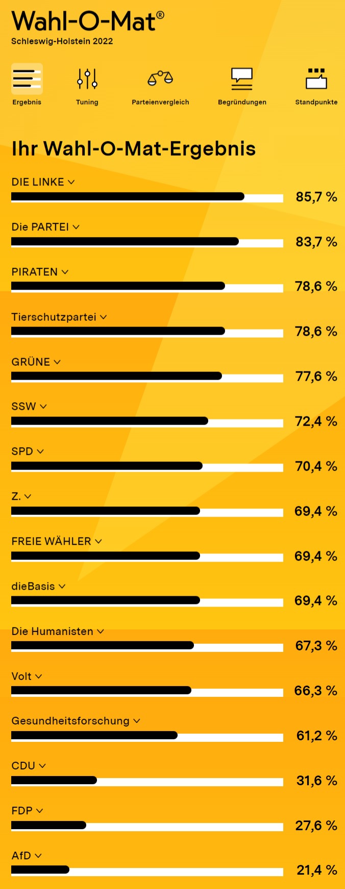 Den Wahl-O-Mat für NRW haben wir schon gemacht und hier präsentiert. Mit dem für S-H ist es schon etwas knapp, aber nicht zu spät und hier, liebe Leser:innen, ist das Ergebnis: