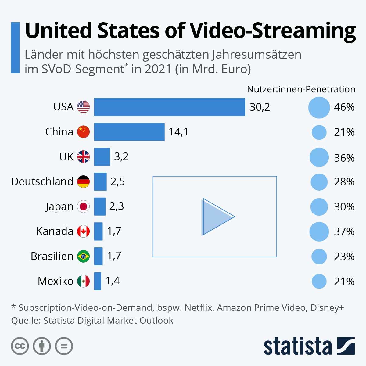 Rund 2,5 Milliarden Euro wurden voraussichtlich bei einer Penetration von 28 Prozent in diesem Segment im Jahr 2021 umgesetzt. Damit landet Deutschland in der Top 5 hinter China und dem Vereinigten Königreich. Generell nimmt der nordamerikanische Kontinent eine wichtige Rolle für Streaming-Anbieter ein, mit den bereits genannten USA, Kanada und Mexiko sind alle drei geografisch zur entsprechenden Region gehörenden Länder in den Top 8 vertreten.