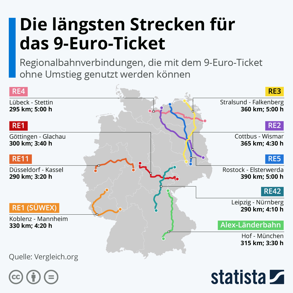 Wer ein 9-Euro-Ticket hat, kann damit ab heute im Nah- und Regionalverkehr unterwegs sein. Dabei können mitunter sehr weite Strecken ohne Umsteigen zurückgelegt werden. Das zeigt die Statista-Grafik auf Basis einer Erhebung des Portals Vergleich.org. Zu den längsten unterbrechungsfreien Strecken zählen dabei die Verbindungen zwischen Rostock und Elsterwerda, Cottbus und Wismar und Stralsund und Falkenberg.