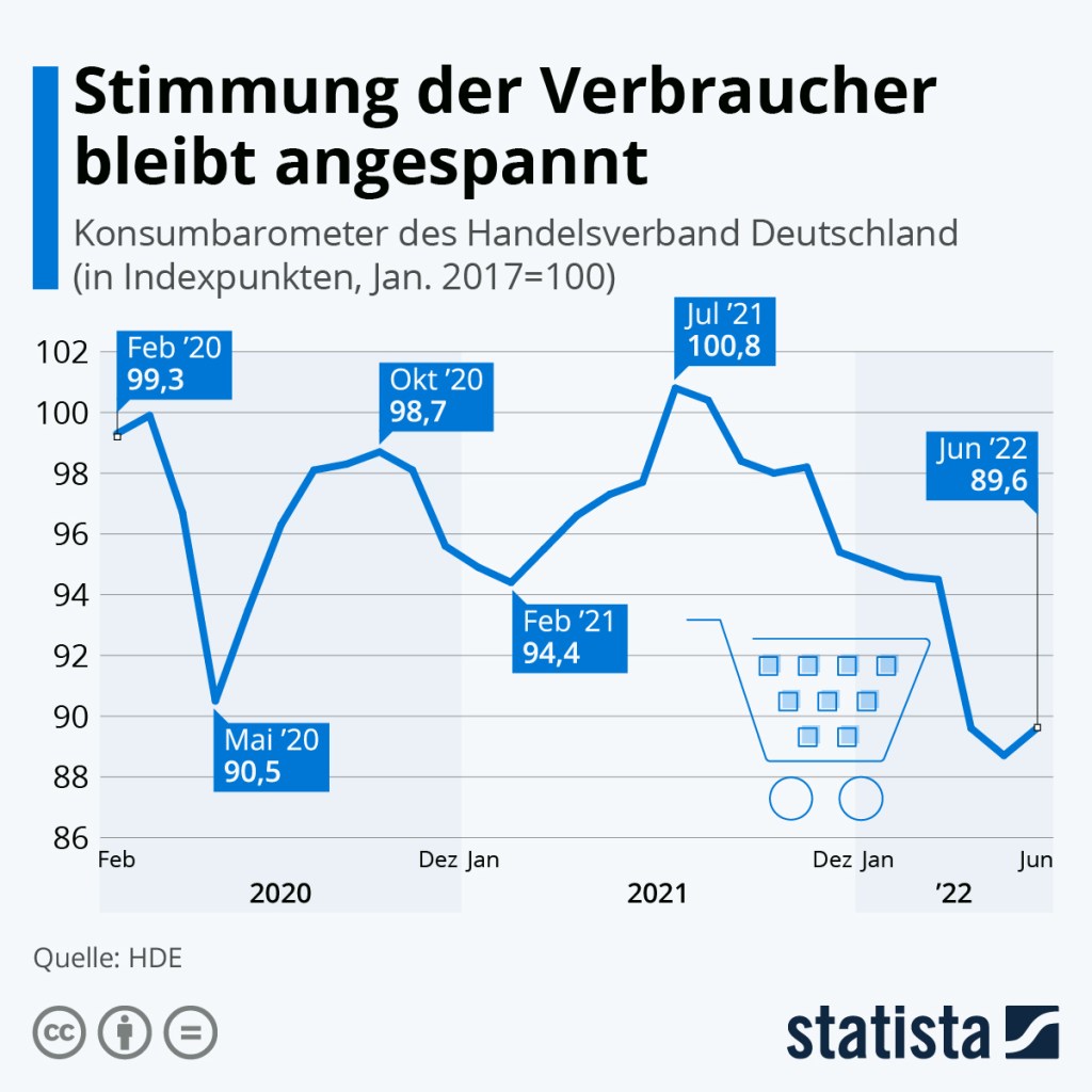 Die Stimmung der Verbraucher in Deutschland bleibt trübe, der monatelange Fall des Konsumbarometers ist aber vorerst gestoppt. Wie die Statista-Grafik zeigt, liegt das Konsumbarometer des Handelsverbands Deutschland (HDE) zuletzt beim Stand von 89,6 Punkten. Gegenüber dem Vormonat ist das zwar ein leichtes Plus von 0,9 Punkten, gegenüber dem Stand von Juni 2021 allerdings ein Minus von 8,1 Punkten.
