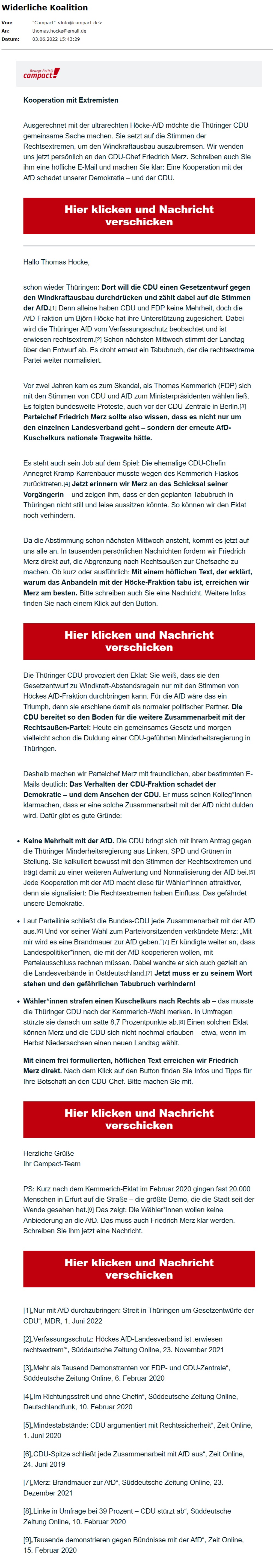 Hinzu kommt in diesem Fall, dass der Zweck der „AG AfD + CDU“ ein in der Tat widerlicher und schändlicher ist, nämlich den Ausbau der erneuerbaren Energien zu bremsen.. Da wir den Beitrag von Campact wieder als Foto beigefügt haben, hier der Link zur Kampagne. In Berlin sind die CDU und die FDP übrigens auch nicht sehr wählerisch, wenn es darum geht, mit der AfD zusammen gegen die Stadtregierung aus SPD, Grünen und Linken zu arbeiten. Auf Bezirksebene kommt das immer wieder vor. Wir sind nicht sicher, dass die CDU bei der unten angesprochenen, bald anstehenden Niedersachsenwahl einen großen Schaden durch die Thüringer Zusammenarbeit mit der AfD davontragen wird, ihrer Reputation in der „Mitte“ wird es aber auf jeden Fall schaden.