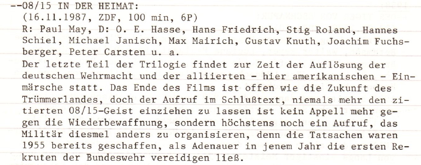 Zur Trilogie haben wir uns im Rahmen der Einbettung der Rezension zu Teil 1 bereits ausführlicher geäußert. Es scheint, als ob die zeitgenössischen Kritiken zum dritten Teil um Nuancen positiver ausgefallen sind als beim zweiten, der somit der schwächste Akt gewesen wäre. Vielleicht war in der Tat gerade die Ostfront 1955 noch nicht sachgerecht darzustellen, während das davor und danach etwas satirischer angegangen werden konnte. Ich hatte seinerzeit zwischen Teil 2 und Teil 3 keinen Unterschied bei der Bewertung gemacht, aber Teil 1 mit sieben Punkten höher angesetzt.