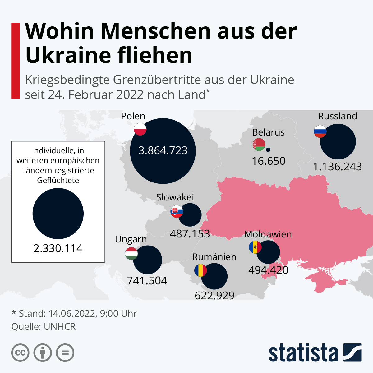 Laut offiziellen Quellen wurden rund 3,9 Millionen Grenzübertritte zu Fuß, per Bus, Auto oder Zug in das Nachbarland registriert. Durch die Intensivierung der Kampfhandlungen im östlichen Teil der Ukraine in den vergangenen Wochen haben auch Grenzüberquerungen nach Russland deutlich zugenommen. 1,1 Millionen Fälle wurden laut offiziellen Angaben protokolliert, deutlich mehr als nach Ungarn, Rumänien und Moldawien, die bislang die Hauptlast der Geflüchtetenwelle getragen hatten.
