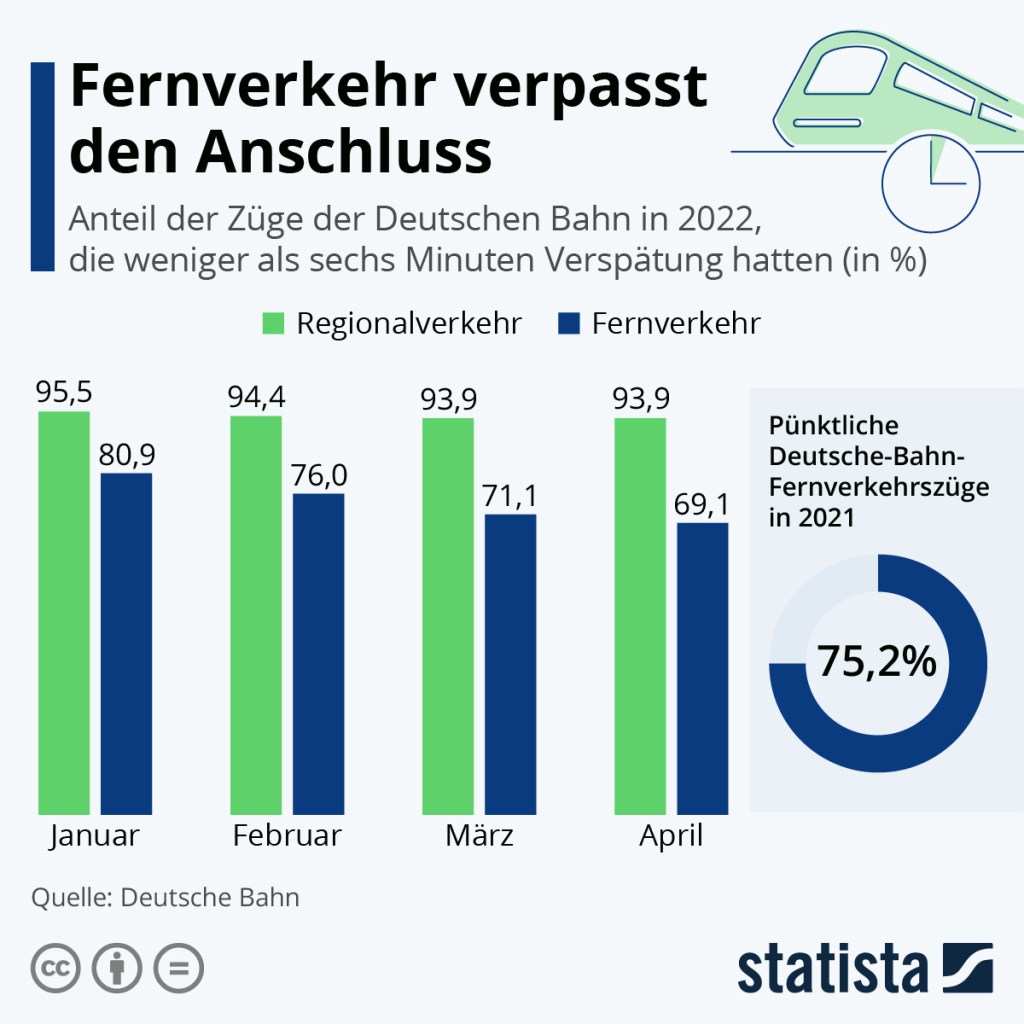Pünktlich zum Start des 9-Euro-Tickets hatte Statista eine Grafik zur Pünktlichkeit der Deutschen Bahn AG im Fernverkehr herausgegeben. Mittlerweile ist das 9-Euro-Tickt vier Wochen alt, sorgt wegen der überfüllten Züge für viel Gesprächsstoff und höhere Corona-Infektionszahlen, ebenso wie der Tankrabatt ins Gerede gekommen ist, weil sich die Mineralölkonzerne die Steuererleichterungen in die Tasche stecken.