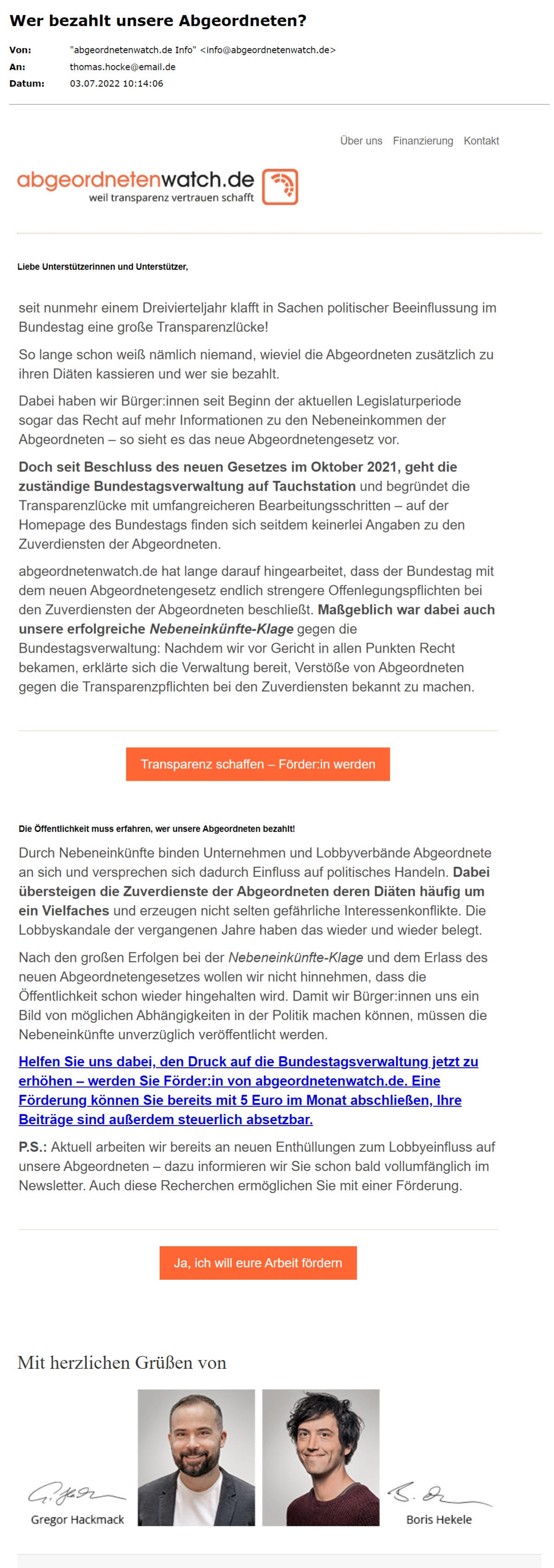 Zum Update der Text von Abgeordnetenwatch, den wir heute erhalten haben. Da wir ihn als Foto präsentieren, hier der Link, mit dem Sie diese wichtige NGO fördern können.