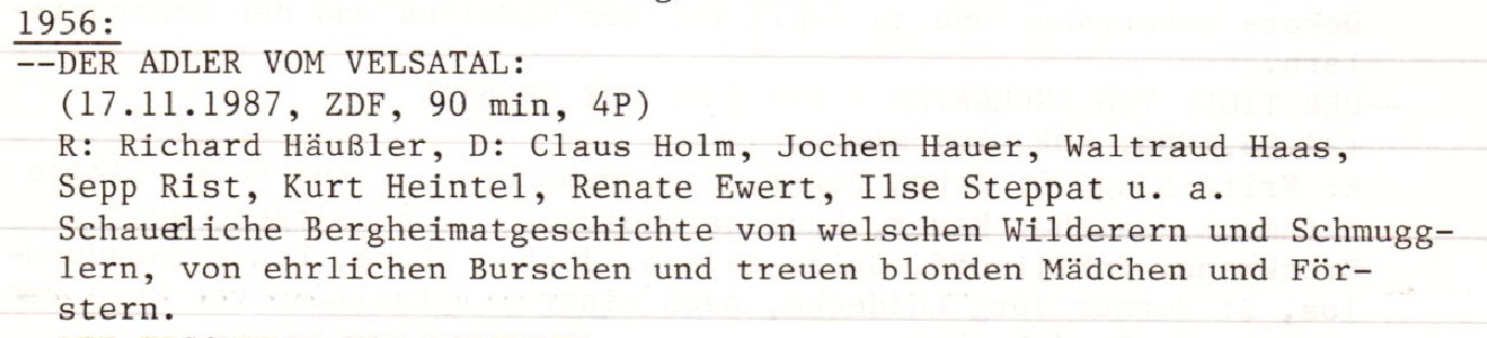 Bereits im Frühstadium unserer Befassung mit dem Medium Film und ohne die oben zitierten Rezensionen zu kennen, war uns immerhin aufgefallen, dass dieser Berg-Heimatfilm kein Meisterwerk ist. Wir haben bisher im Rahmen der Durcharbeitung des „Filmverzeichnis Nr. 8“ aus dem Jahr 1989 nur wenige Heimatfilme besprochen, weil sie schon damals nicht das Zentrum unserer Interesses darstellten. Typisch für die Produktionen der Zeit war „Der Adler vom Velsatal“ aber sicherlich mehr als die Streifen, die heute noch einen gewissen Bekanntheitsgrad aufweisen. In einigen davon spielt auch Waltraud Haas, die hier die weibliche Hauptrolle innehat und eine der beliebtesten Schauspielerinnen in diesem deutsch-österreichischen Spezialgenre war (u. a. Hauptrolle in der sehr erfolgreichen 1960er Verfilmung von „Das weiße Rössl vom Wolfgangsee“).