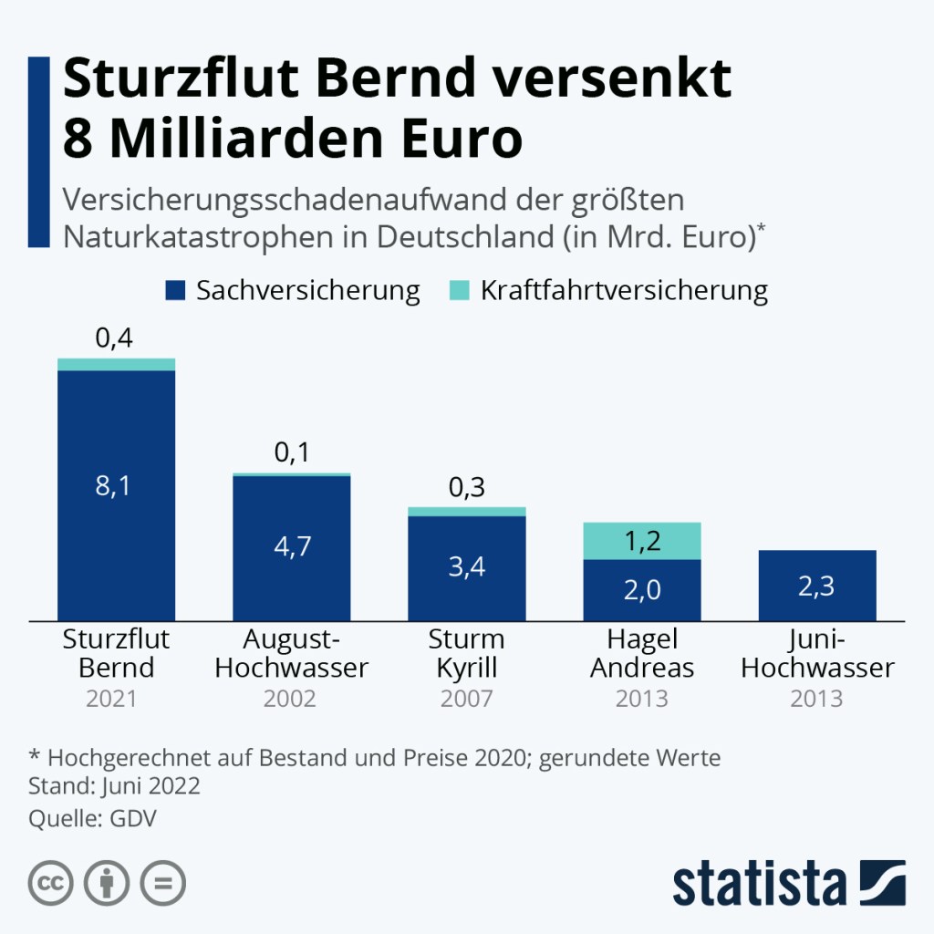 Zum Abschluss des Tages haben wir noch einen kleinen Info-Artikel für Sie, liebe Leser:innen. Sie erinnern sich gewiss an die Sturzflut im August 2021, die das Ahrtal zu trauriger Berühmtheit führte. Sie hieß Bernd. Früher hätte sie einen weiblichen Namen gehabt, wie alle Schlechtwetterlagen und Tiefdruckgebiete, aber nun steht Bernd für den bisher verheerendsten Schaden, den eine Wetterlage in Deutschland angerichtet hat. Zumindest versicherungstechnisch. Wir kommentieren heute nicht die üblichen Anmerkungen zu Klima und Umwelt hinter den Begleittext zur Grafik von Statista, Sie wissen sowieso längst Bescheid darüber, dass wir mehr gegen den Klimawandel tun müssen.
