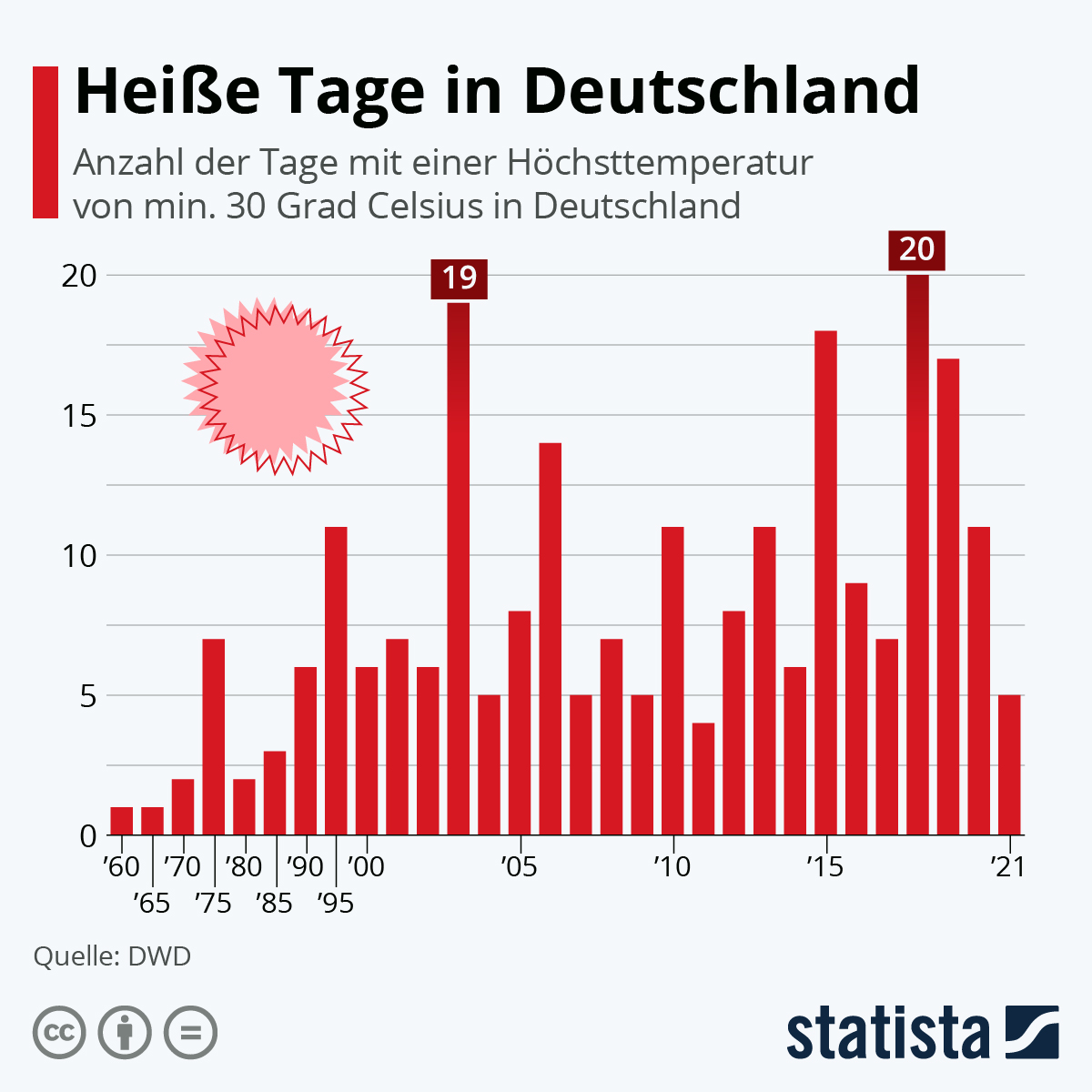 In den letzten 20 Jahren hat es immer wieder Jahre mit besonders vielen heißen Tagen gegeben. Wie die Statista-Grafik auf Basis der Daten des Deutschen Wetterdienstes zeigt, waren vor allem 2003 (19 Hitzetage) und das Rekordjahr 2018 (20 Hitzetage) sehr heiße Jahre.
