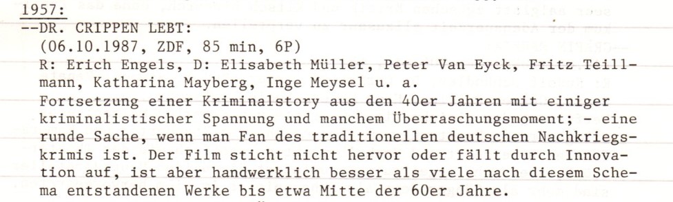 Da ich den Film sehr lange nicht mehr gesehen habe, kann ich keine Angaben dazu machen, ob ich heute eher meiner Einschätzung aus dem Jahr 1989 zuneigen würde oder dem Filmlexikon. Die IMDb-Nutzer:innen bewerten ihn mit durchschnittlich 5,9/10, liegen also etwa auf dem Niveau meiner damaligen Punktzahl.