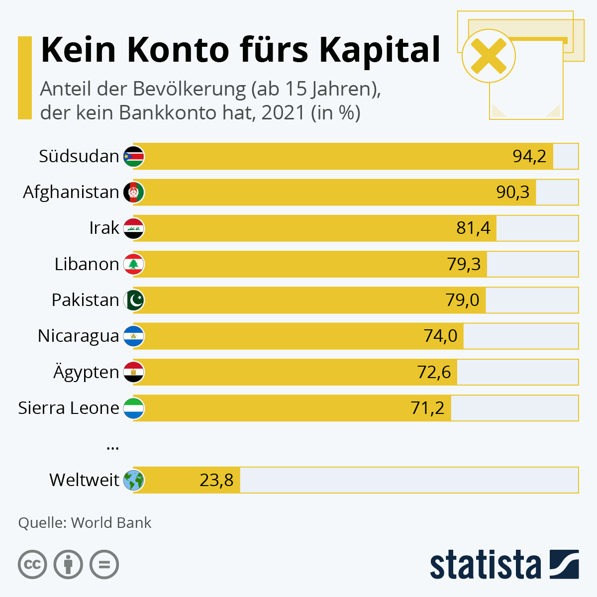 Das eigene Bankkonto ist die Grundvoraussetzung finanzieller Inklusion. Die Möglichkeit, Ersparnisse sicher aufzubewahren oder Überweisungen von Familien oder Freunden erhalten zu können, erschwert aus Sicht der Weltbank ein Abrutschen in die Armut. Der Global Findex Database 2021 zufolge haben aktuell drei Viertel der Weltbevölkerung ab 15 Jahren ein Bannkonto, in Deutschland sind es sogar nahezu 100 Prozent. Das krasseste Gegenbeispiel zu bundesrepublikanischen Verhältnissen ist der Südsudan – 94,2 Prozent der dortigen Bevölkerung fehlt die Möglichkeit, vorhandene Mittel sicher aufzubewahren. Ähnlich hoch ist der Anteil der Kontolosen nur noch in Afghanistan. Besonders betroffen sind vor allem Länder im Nahen Osten und Afrika, wie der Blick auf die Statista-Grafik andeutet. Aber auch ein südamerikanisches Land findet sich im Ranking der Top 8 Unbanked (Englisch für Erwachsene Ohne Bankzugang) Nationen – in Nicaragua müssen drei Viertel der Bevölkerung ohne Bankkonto auskommen.