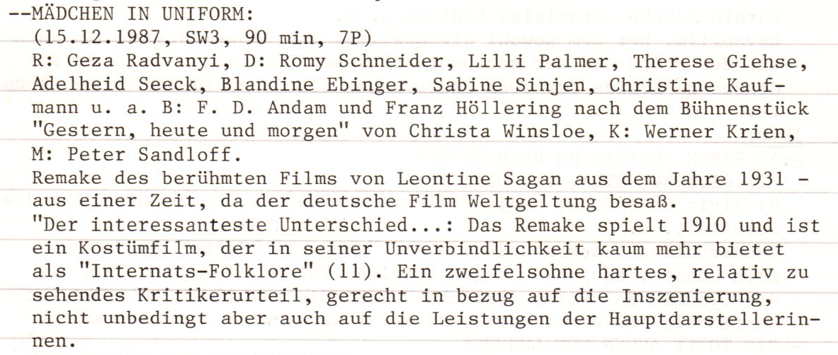 Die meisten zeitgenössischen Kritiken waren eher positiv, obwohl lesbische Liebe damals nicht gerade ein Thema war, das in der Luft lag – anders als m. E. im Jahr 1931, nach einem Befreiungsjahrzehnt für Frauen. Das Filmlex frönt vermutlich vor allem wieder seiner von konservativ-kirchlichen Moralvorstellungen durchtränkten Sicht auf Filme. Manchmal hat man die harschen, teilweise aus ideologischen Gründen abwertenden Rezensionen der 1950er im Filmlex später geglättet und etwas mehr Objektivität reingebracht, in diesem Fall möglicherweise nicht. Eines ist „Mädchen in Uniform“ sicher nicht: unverbindliche Unterhaltung, schon gar nicht im Vergleich mit anderen Produktionen jener Zeit. Vielmehr zählt der Film zusammen mit Werken wie „Wir Wunderkinder“ und „Das Mädchen Rosemarie“ zu den Spitzenproduktionen aus Westdeutschland , die in jenem Jahr entstanden sind. Unsere damalige Wertung würde sich insofern heute bestätigen, als vermutlich wieder ein Ergebnis im Bereich von 70 bis 80 von 100 zu erwarten sein wird.
