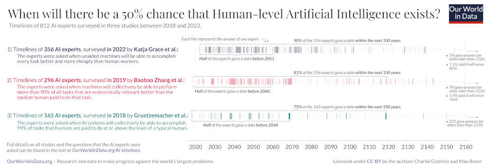 Die große Mehrheit glaubt, dass es in den kommenden Jahrzehnten sogar eine Chance gibt, dass wir KI-Technologie sehen werden, die einen transformativen Einfluss auf unsere Welt haben wird. Während einige lange Zeitpläne haben, halten es viele für möglich, dass wir sehr wenig Zeit haben, bevor diese Technologien ankommen. In den drei Umfragen glaubt mehr als die Hälfte, dass es eine 50-prozentige Chance gibt, dass eine KI auf menschlicher Ebene vor einem bestimmten Zeitpunkt in den 2060er Jahren entwickelt wird, einer Zeit, die weit in der Lebenszeit der heutigen jungen Menschen liegt.