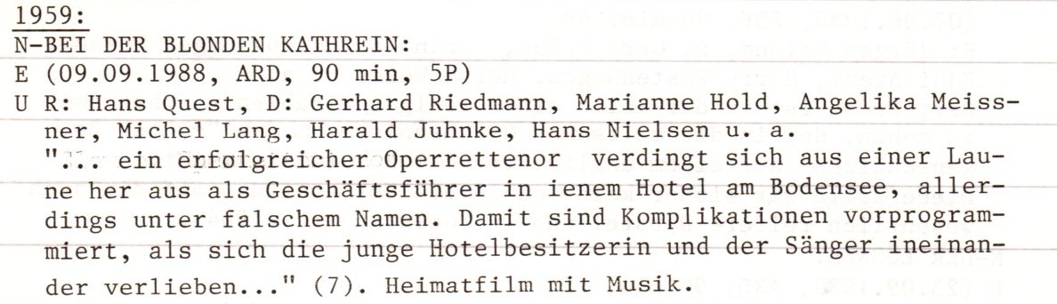 Doch, ein Satz. Wir haben einige der Hochkaräter aus der westdeutschen Produktion der 1950er schon im Filmverzeichnis Nr. 8 von 1989 beschrieben, also recht früh – aber der interessantere, weil viel breiter gefasste Überblick kommt erst im zweiten Durchlauf mit deutschen Filmen. Da sind wir aber gerade erst bei den Jahren von 1923 bis 1925. Die wichtigsten deutschen Filme der 1920er wollen wir so weit sichten, wie es bezüglich der technischen Qualität halbwegs vernünftige Kopien bzw. Internet-Uploads zum Anschauen gibt. Aber Filme wie „Bei der blonden Kathrein“ gehören zu den wenigen aus diesen Jahren, die immer noch im Fernsehen gezeigt werden. Mit Verlaub, da gäbe es auch aus den 1950ern Besseres.