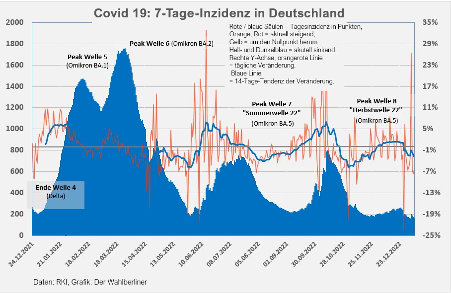 Die Inzidenz sinkt weiter, auf heute 163, das ist gut. Aber die Todesfallzahlen steigen weiter, heute wurden 262 gemeldet, die Zahlen der letzten Tage lagen permanent weit über 200, einmal sogar über 300. Die Testpflicht für Einreisende aus China kommt, wie wir seit gestern wissen, immerhin.