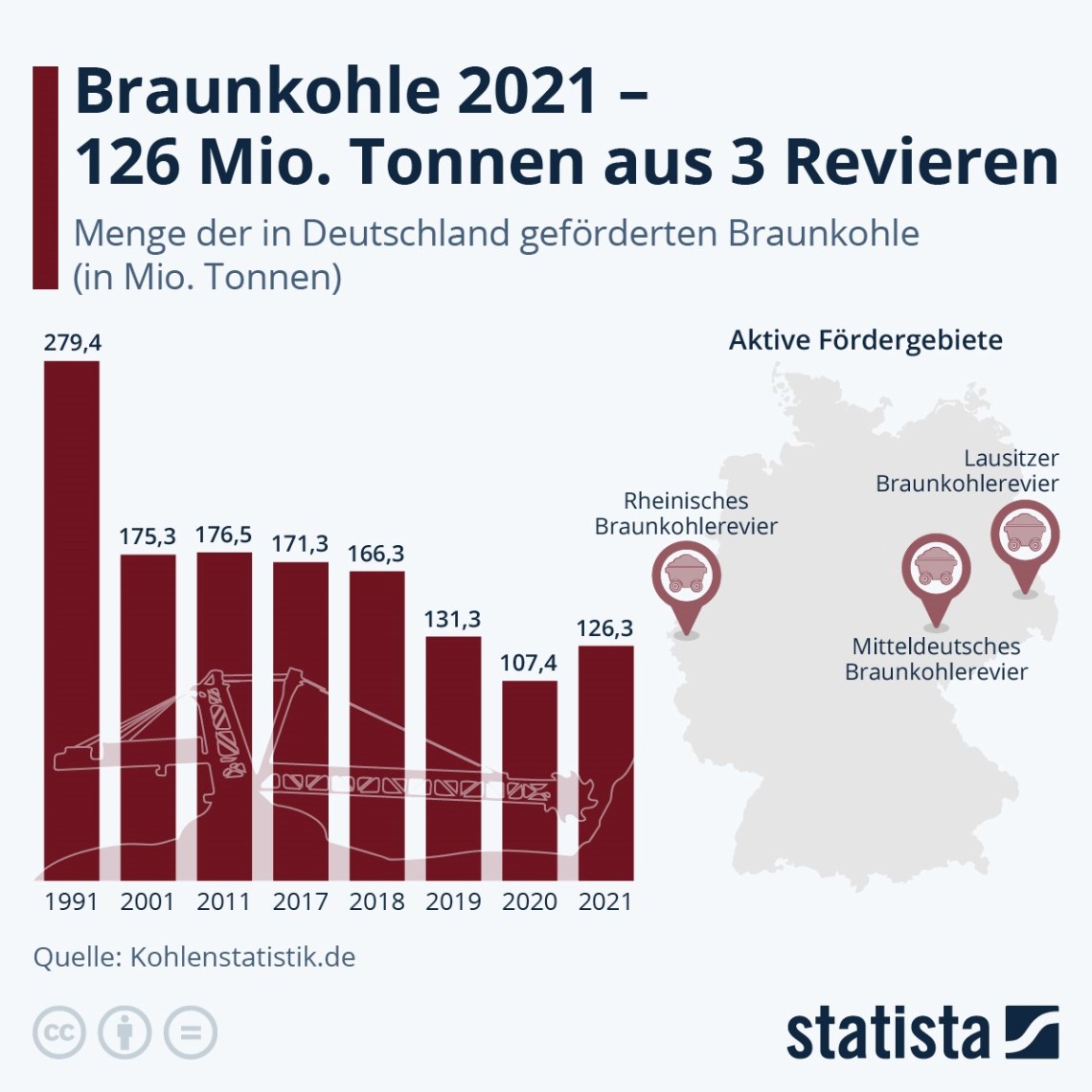 Infografik: Braunkohle 2021 – 126 Millionen Tonnen aus 3 Revieren | Statista