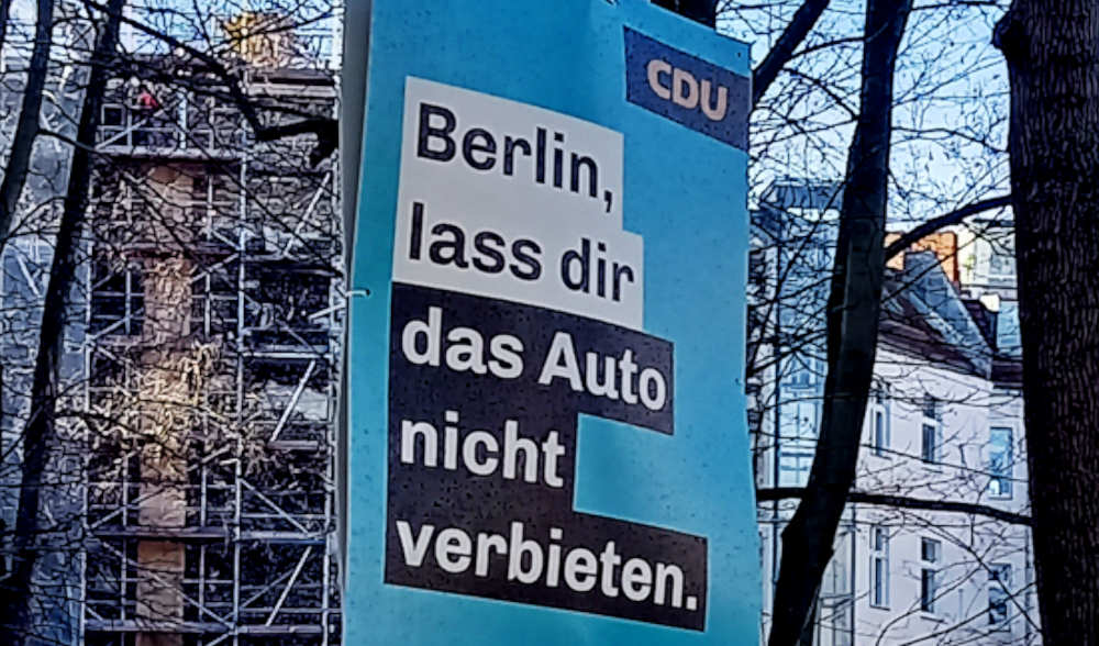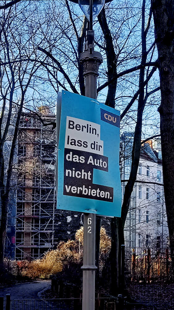 Das Beunruhigende daran: Die Giffey-SPD und die Wegner-CDU hätten für eine gemeinsame Regierungsarbeit aufgrund ihrer beinahe unterschiedslos konservativen Ausrichtung große Übereinstimmungen. Die CDU, das ist die Partei, die sich selbst entlarvt mit Plakaten wie dem hier abgebildeten. Wenn man keine progressiven Ideen hat: platter als platt nach rückwärts und die Autofanatiker bedienen geht immer. Die CDU ist nicht für den Fortschritt zuständig, aber wenn es des Fortschritts bedarf, darf man sie eben nicht wählen. Dieses Plakat hätte übrigens auch von Franziska Giffey stammen können.