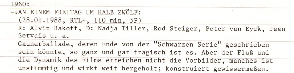 Ein Grund dafür könnte sein, dass ich ihn an Filmen mit ähnlicher Thematik wie Robert Siodmaks totalem Film noir „Criss Cross“ (1949) gemessen habe. Im Vergleich zur Wucht guter US-Thriller wirken diese europäischen Produktionen oft seltsam leichtgewichtig, interessanterweise vor allem dann, wenn sie sehr international sind. Der Handlung nach ist allerdings „An einem Freitag um halb zwölf …“ auch ein Film noir.