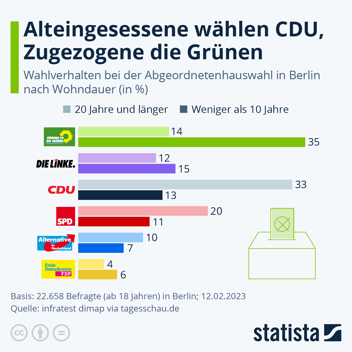 Besonders bei Wahlen in den deutschen Stadtstaaten hat auch die Wohndauer der Bürger:innen einen starken Einfluss auf das Wahlverhalten. Wie die Statista-Grafik mit Daten von infratest dimap, die in der tagesschau veröffentlicht wurden zeigt, konnte die CDU vor allem die alteingesessenen Berliner:innen von sich überzeugen. Rund 33 Prozent der Stimmen von Menschen, die schon mindestens 20 Jahre in Berlin leben, gingen an Spitzenkandidat Kai Wegner und seine Partei. Die SPD kommt bei den Ur-Berliner:innen auf 20 Prozent, die Grünen erreichen 14 Prozent der Stimmen.