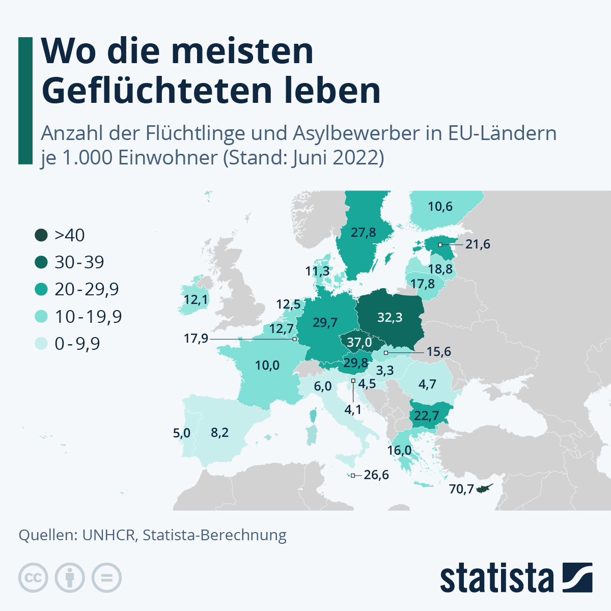Die hohen Zahlen, die Polen und Ungarn aufweisen, sind hingegen der aktuellen Lage, dem Ukraine-Krieg zuzurechnen. Wir werden diese Grafik und den Statista-Erklärungstext in Bezug nehmen, wenn neuere Zahlen veröffentlich werden. Gerade in Deutschland dürfte sich die Quote der Geflüchteten und Asylsuchenden, gerechnet auf die Gesamtbevölkerung, seit Juni 2022 noch einmal erheblich erhöht haben: