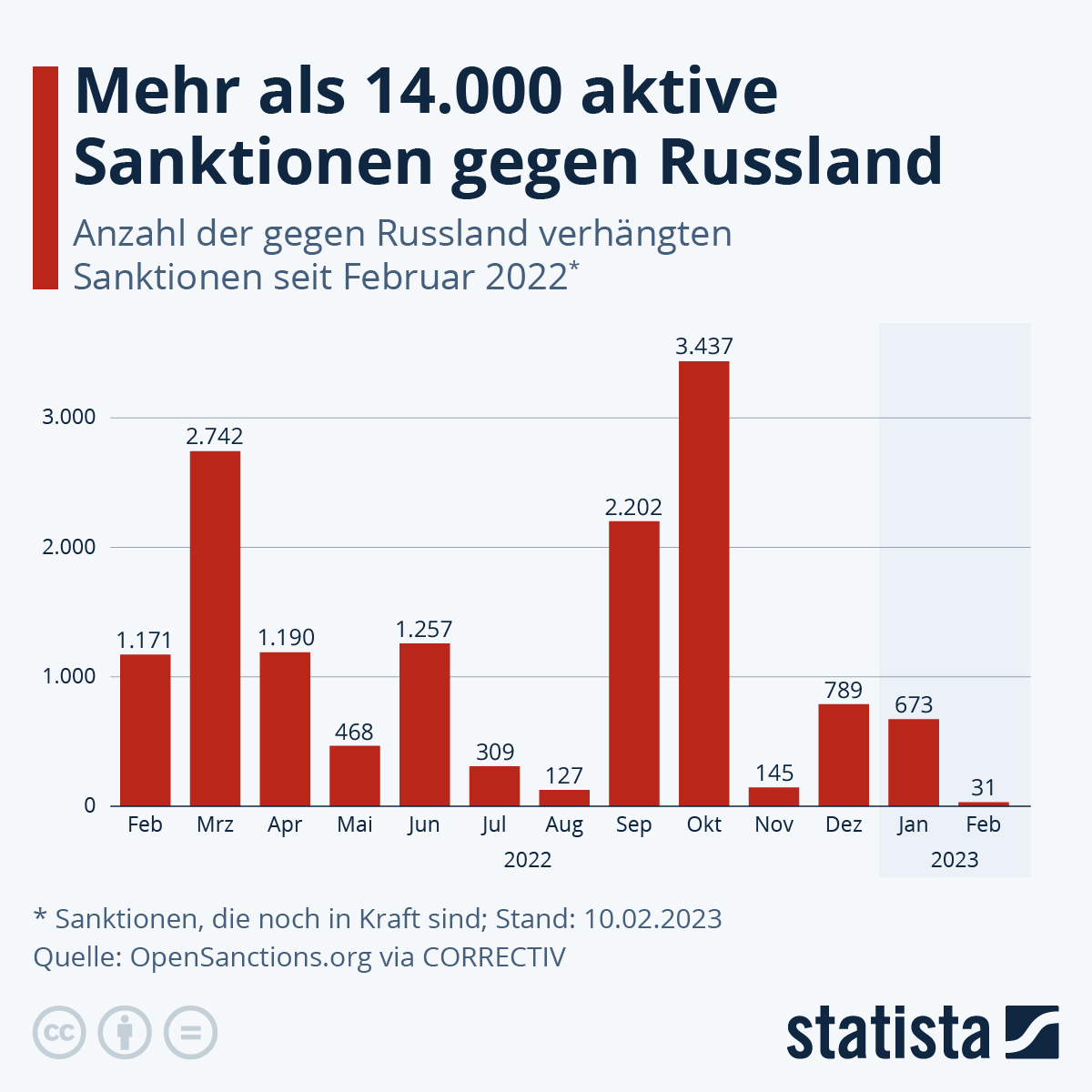 Seit einem Jahr wütet der Krieg in der Ukraine. Während die Ukrainier:innen sich militärisch gegen den Aggressor Russland verteidigen, sind die Waffen des Westens eher ökonomischer Natur. Schon im Februar 2022, wenige Tage nach den ersten Angriffen, wurde Russland mit mehr als 1.000 wirtschaftlichen Sanktionen belegt. Seitdem sind jeden Monat mindestens 100 bis teilweise über 3.000 neue Beschränkungen hinzugekommen, wie eine Auswertung der OpenSanctions-Datenbank von CORRECTIV zeigt. Aktuell werden mehr als 14.500 (Stand: 10.02.2023) aktive Sanktionen gegen russische Unternehmen, Institutionen oder Einzelpersonen gezählt.