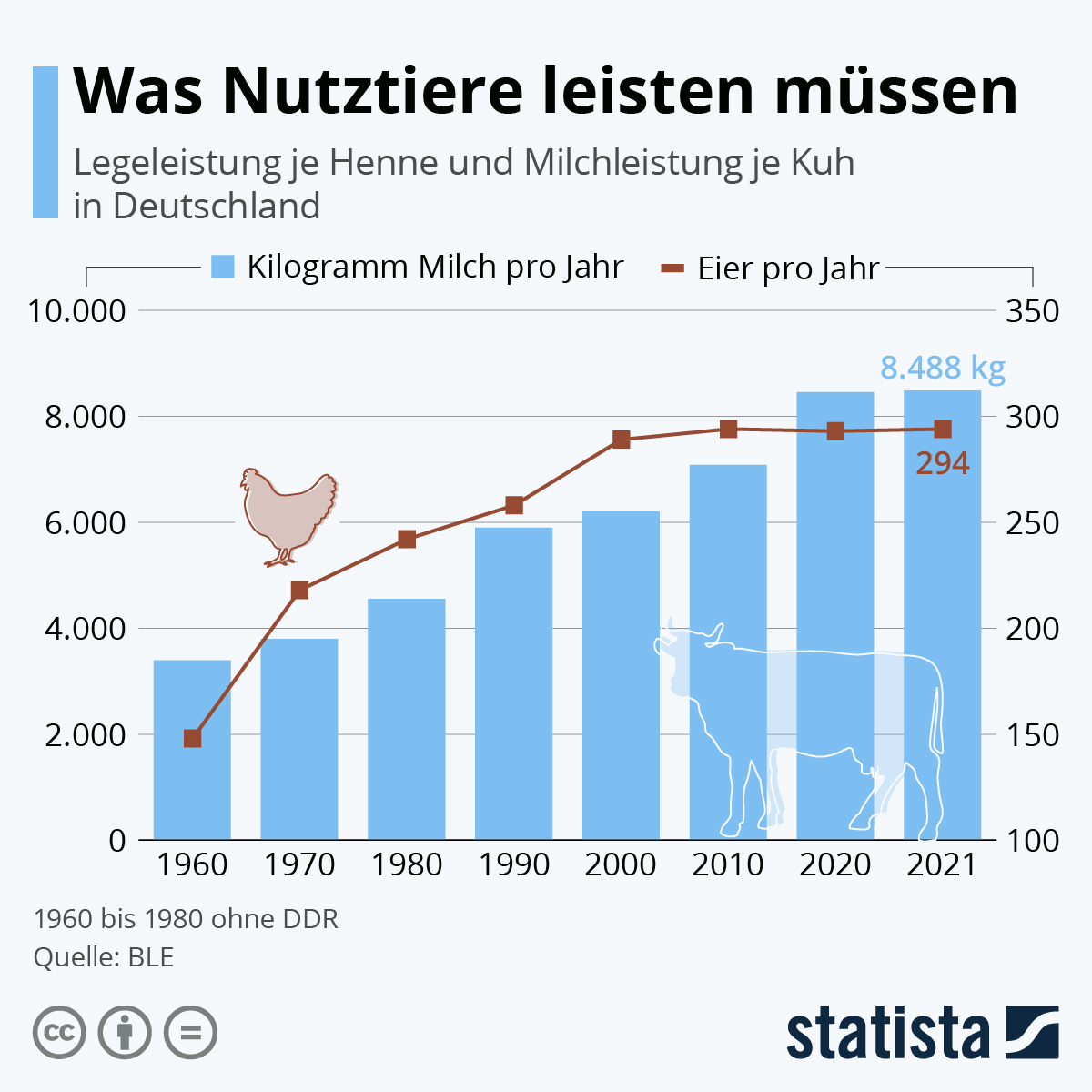 Die Viehzucht in Deutschland hat sich in den vergangenen gut 50 Jahren immer mehr zur Hochleistungsproduktion entwickelt. So ist die Legeleistung von Hennen um etwa 98 Prozent und die Milchleistung von Kühen um ganze 149 Prozent seit 1960 angestiegen. Wie die Grafik von Statista auf Basis von Zahlen der Bundesanstalt für Landwirtschaft und Ernährung (BLE) zeigt, legte eine Henne damals 148 Eier pro Jahr – 2021 waren es 294. Eine Milchkuh gab 3.395 Liter Milch, während es 2021 8.488 Liter waren.