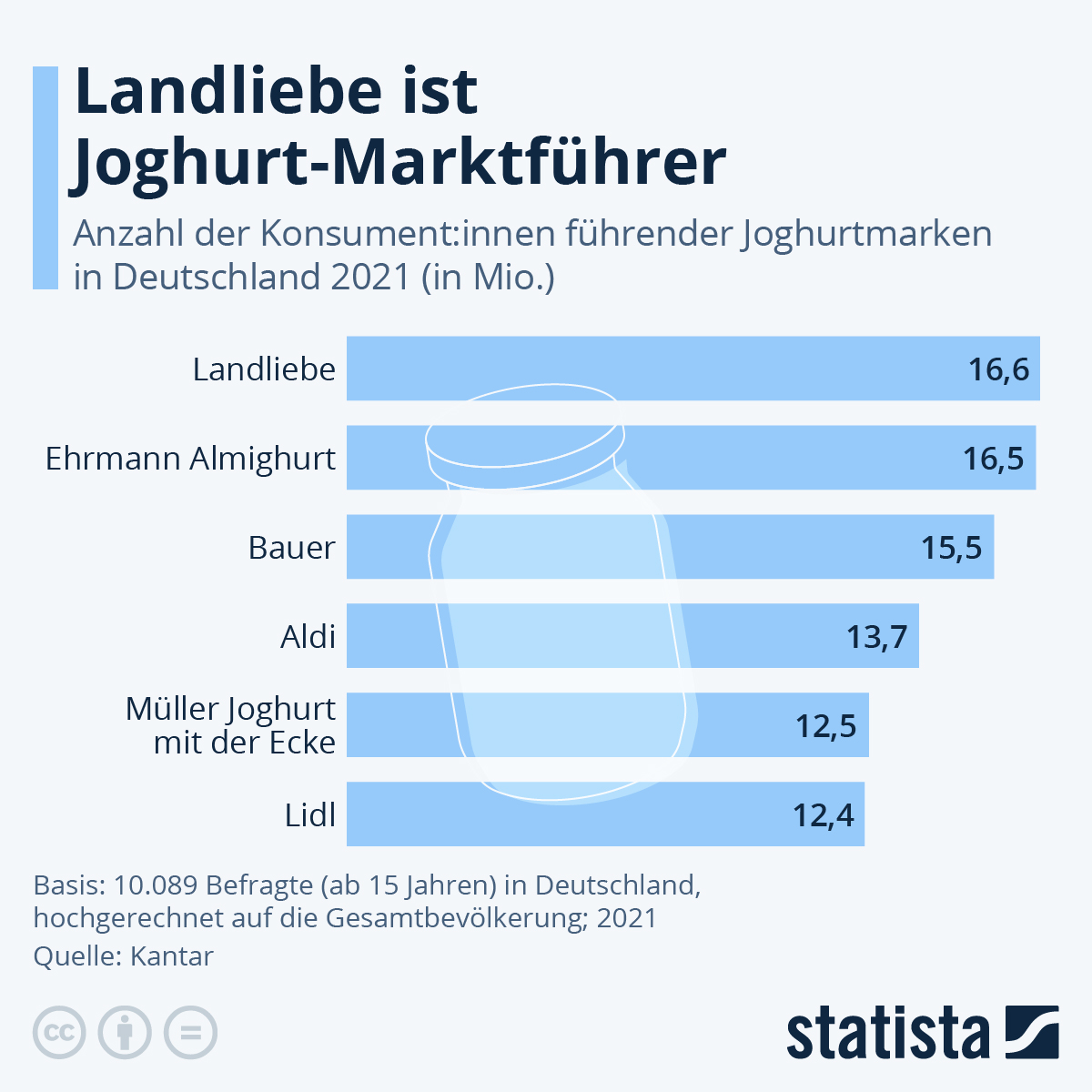 Die Traditionsmarke Landliebe ist die Nummer eins unter den Joghurts in Deutschland. Laut Daten des Marktforschungsinstituts Kantar konsumieren etwa 16,6 Millionen Menschen in der Bundesrepublik das cremige Molkereiprodukt aus dem Hause FrieslandCampina. Schärfster Verfolger ist der Almighurt von Ehrmann mit 16,5 Millionen Konsument:innen vor den Joghurt-Varianten von Bauer (15,5 Millionen). Ebenfalls unter den beliebtesten Joghurts in Deutschland sind die Eigenmarken der Discounter Aldi (13,7 Millionen) und Lidl (12,4 Millionen) sowie “Der Joghurt mit der Ecke” von Müller (12,5 Millionen).