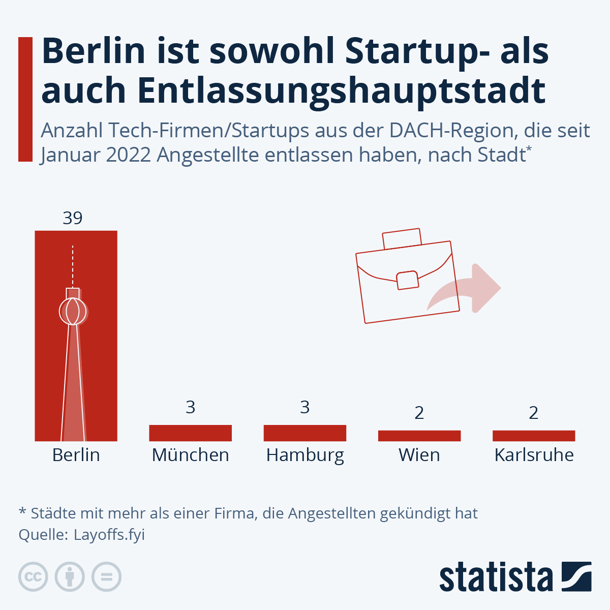 Laut Daten von Layoffs.fyi sichert sich Berlin den zweifelhaften ersten Platz hinsichtlich der meisten in den jeweiligen Städten ansässigen Firmen aus den entsprechenden Sektoren, die seit Januar 2022 ihre Belegschaft reduziert haben. Die Zahl von 39 Tech-Unternehmen und Startups mit Kündigungen lässt sich auch durch die hohe Dichte entsprechender Firmen in der Stadt erklären. 2022 wurden beispielsweise allein in Berlin 390 Finanzierungsrunden durchgeführt, rund fünf Milliarden Euro und damit die Hälfte des gesamten in Deutschland investierten Risikokapitals flossen in die Hauptstadt.