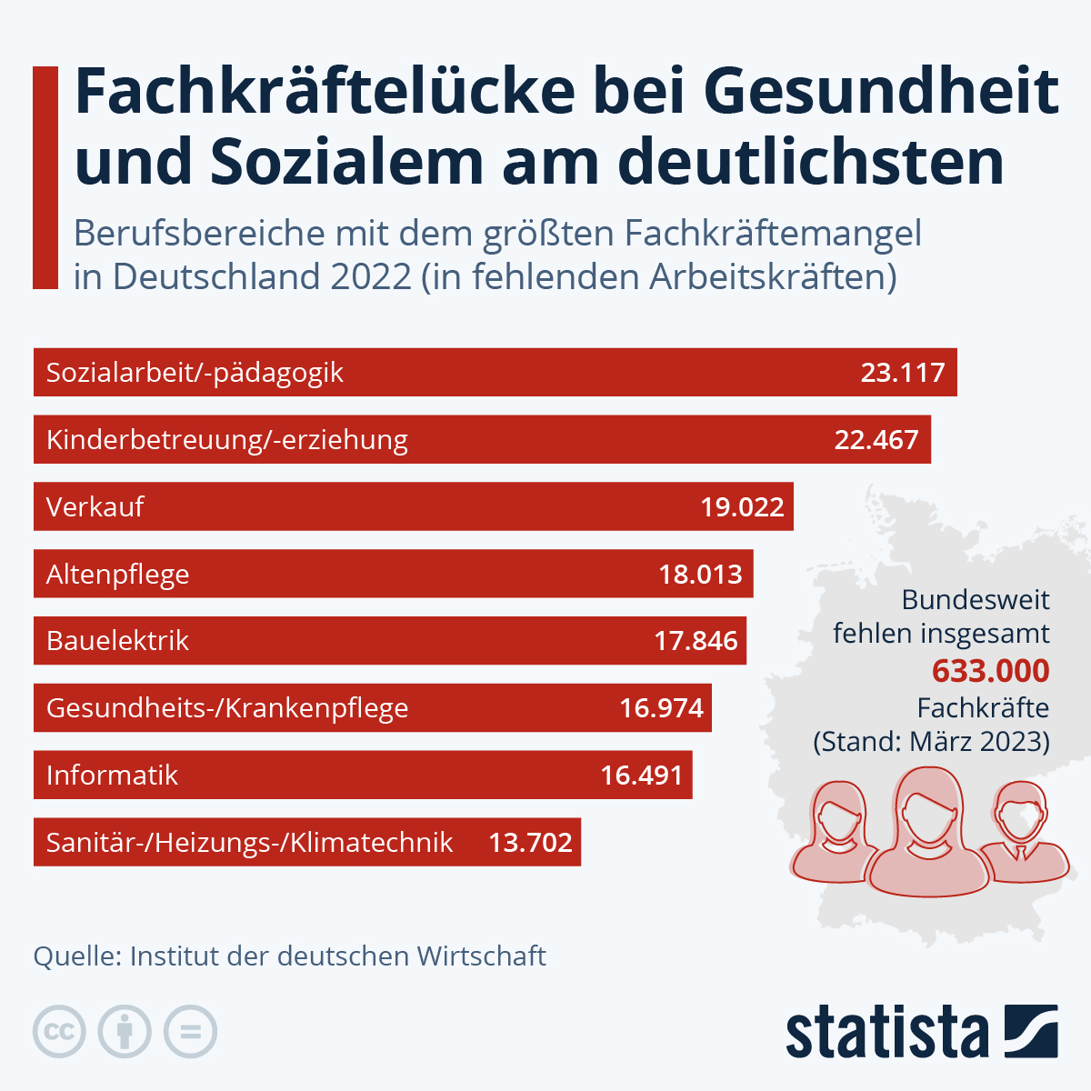 Nach dem Beschluss der Eckpunkte zu einer neuen Regelung für die Fachkräfteeinwanderung im November 2022, haben das Innen- und das Arbeitsministerium am 20. Februar den Beginn der Anhörungen der Länder und Verbände eingeläutet. Durch die Novellierung soll qualifizierten Arbeitnehmer:innen eine berufsbezogene Migration nach Deutschland erleichtert und der Fachkräftemangel vor allem in sozialen und Pflegeberufen in Deutschland abgemildert werden. Wie unsere Grafik zeigt, sind nicht nur diese beiden Berufszweige von der Fachkräftelücke betroffen.