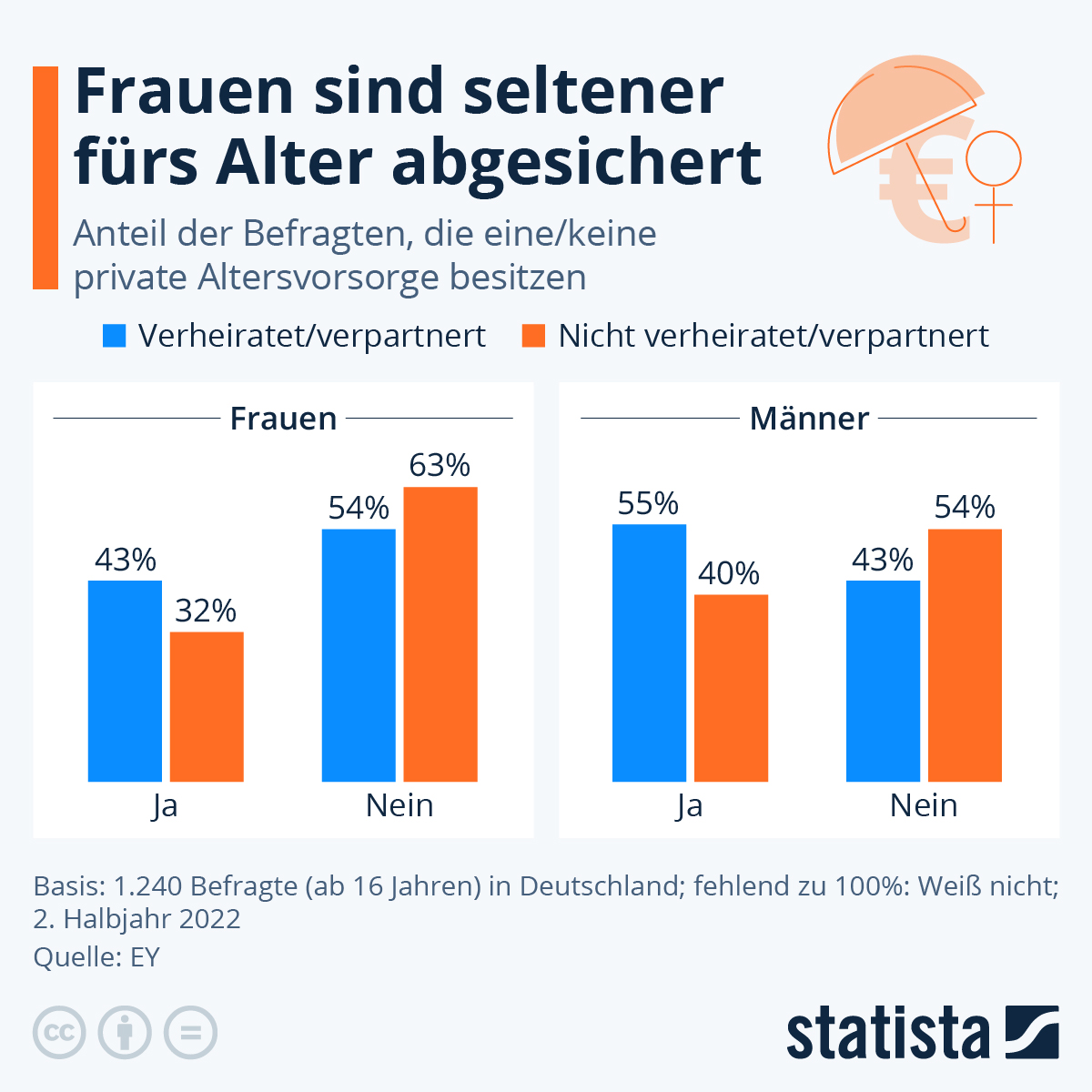 Wie die Statista-Infografik zeigt, haben nur 43 Prozent der verheirateten Frauen und lediglich 32 Prozent der ledigen Frauen eigenen Angaben zufolge eine private Altersvorsorge abgeschlossen. Bei den Männern sind es jeweils 55 und 40 Prozent.