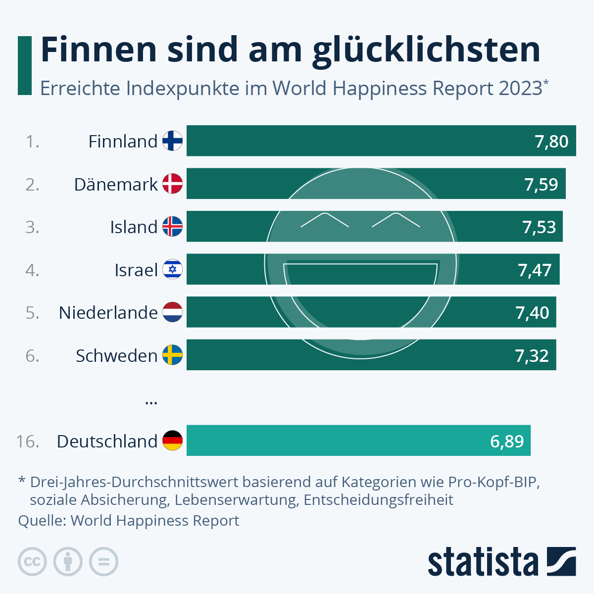 Ach ja: Wir haben Deutschland auf Platz 14 gefunden, nicht auf Platz 16,wie in der Statista-Grafik angegeben und mit einem leicht höheren Glückswert (etwas über 7, in der Statista-Grafik liegt er leicht darunter). Sollten wir beim Abgleich die falsche Grafik erwischt haben, teilen Sie uns das bitte gerne mit.