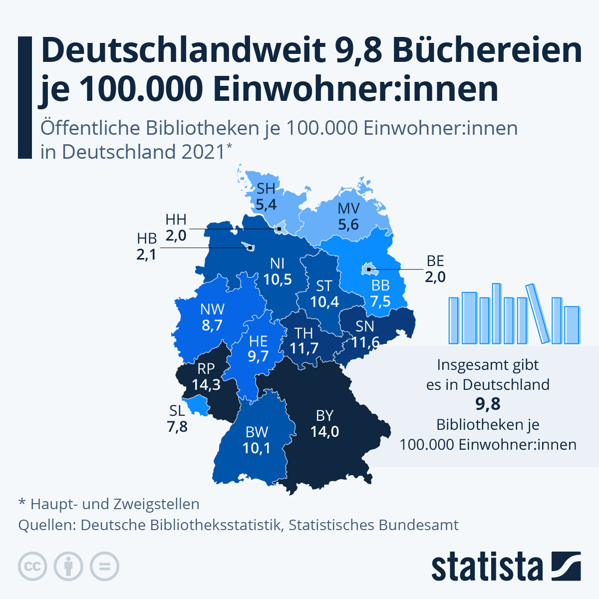 Infografik: Deutschlandweit 9,8 Büchereien je 100.000 Einwohner:innen | Statista
