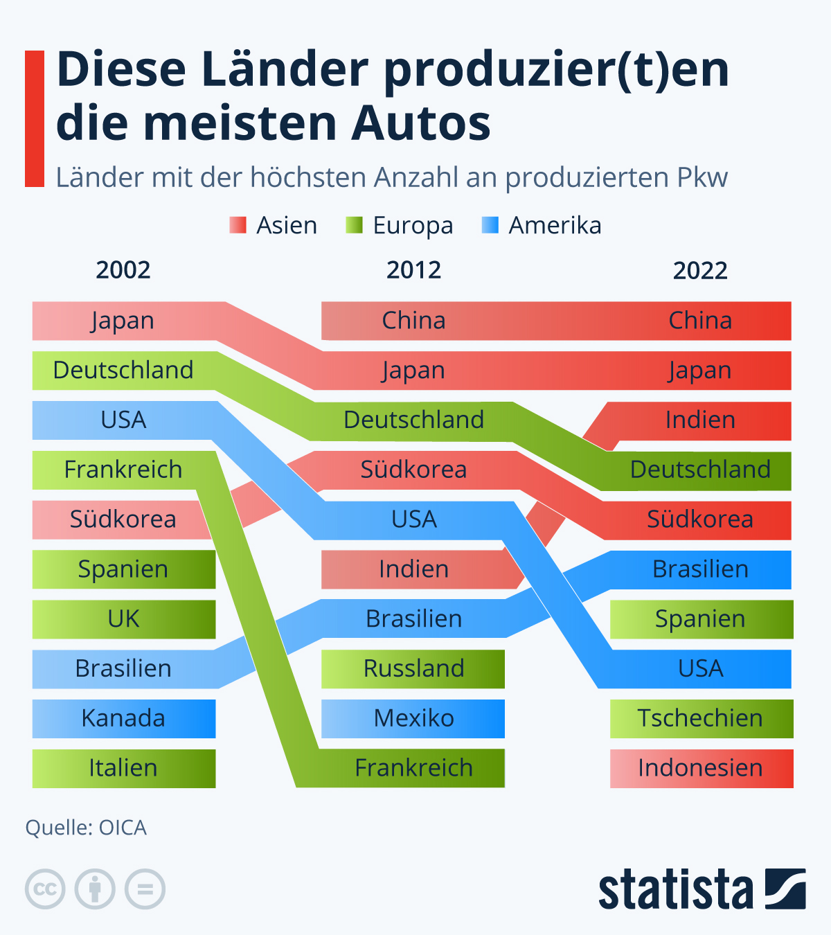 Die meisten Autos rollen heute in China vom Band. Wie die Statista-Grafik auf Basis von Daten der internationalen Automobilherstellervereinigung OICA zeigt, hat sich die Reihenfolge im Ranking der Länder mit der höchsten Anzahl an produzierten Pkw über die Jahre deutlich verändert. So tauchte China im Jahr 2002 noch gar nicht in den Top 10 auf und rangierte damals an Position 14. Zehn Jahre später liegt China bereits an Position eins und hat sich hier seitdem gehalten. China produziert jährlich derzeit rund 24 Millionen Autos, Japan hingegen rund 7 Millionen, gefolgt von Indien (3,48 Mio. Pkw). Deutschland folgt auf Position vier mit zuletzt 3,44 Millionen produzierten Pkw. Im Jahr 2002 lag Deutschland mit 5,12 Millionen Pkw noch an Position zwei.