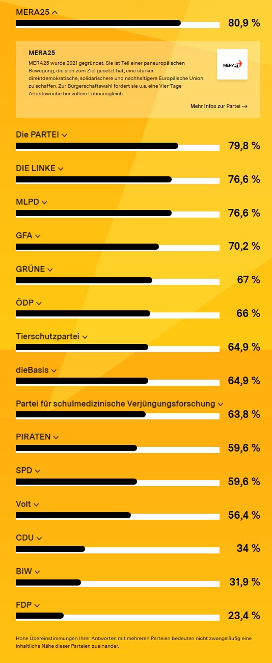 Beinahe traditionell ist Die Partei am Ende weit vorne. Auf dem ersten Platz liegt aber eine Gruppierung, die wir bisher nicht kannten und die sich MERA nennt.