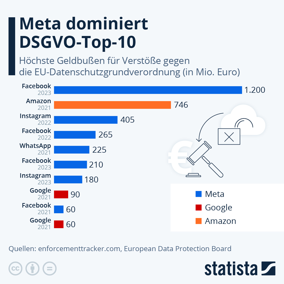 Die irische Datenschutzbehörde DPC hat mit 1,2 Milliarden Euro die bislang höchste Strafe für einen Verstoß gegen die Datenschutzgrundverordnung (DSGVO) verhängt. Zahlungspflichtig soll der Internetkonzern Meta werden, der unter anderem die Plattformen Instagram, WhatsApp und Facebook betreibt. Wie unsere Grafik zeigt, wird die Top 10 der höchsten DSGVO-Geldbußen nahezu ausschließlich von Meta-Produkten belegt.